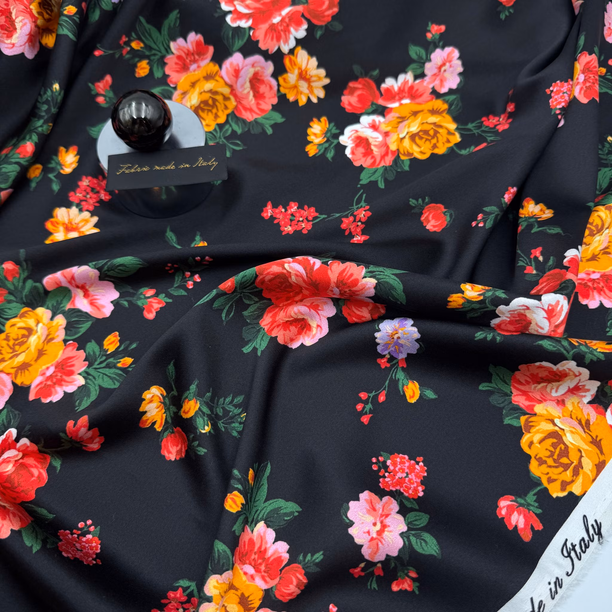 Färg: Svart botten, blommor i rött, senapsgult, rosa och lite lila. Mörkgröna blad.