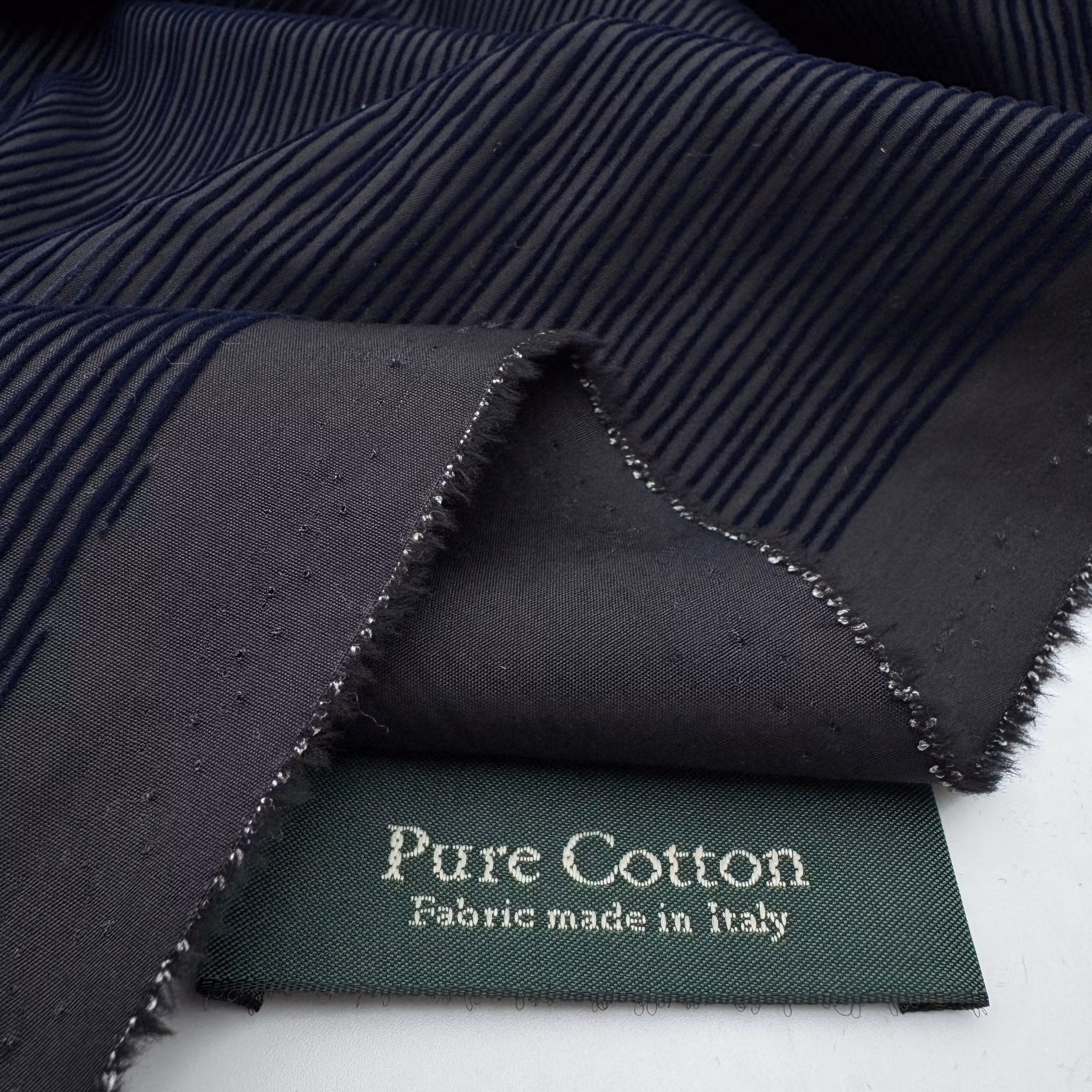 Material: 100% bomull, tunn och skjortkvalitet. Sammetsränder på längden, s.k. flockprint. Cirka 5 ränder per centimeter.