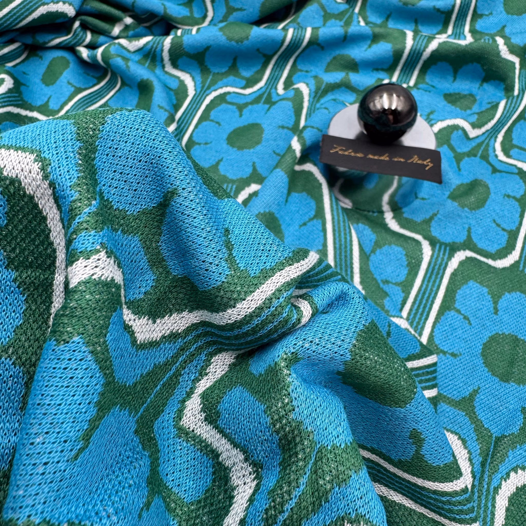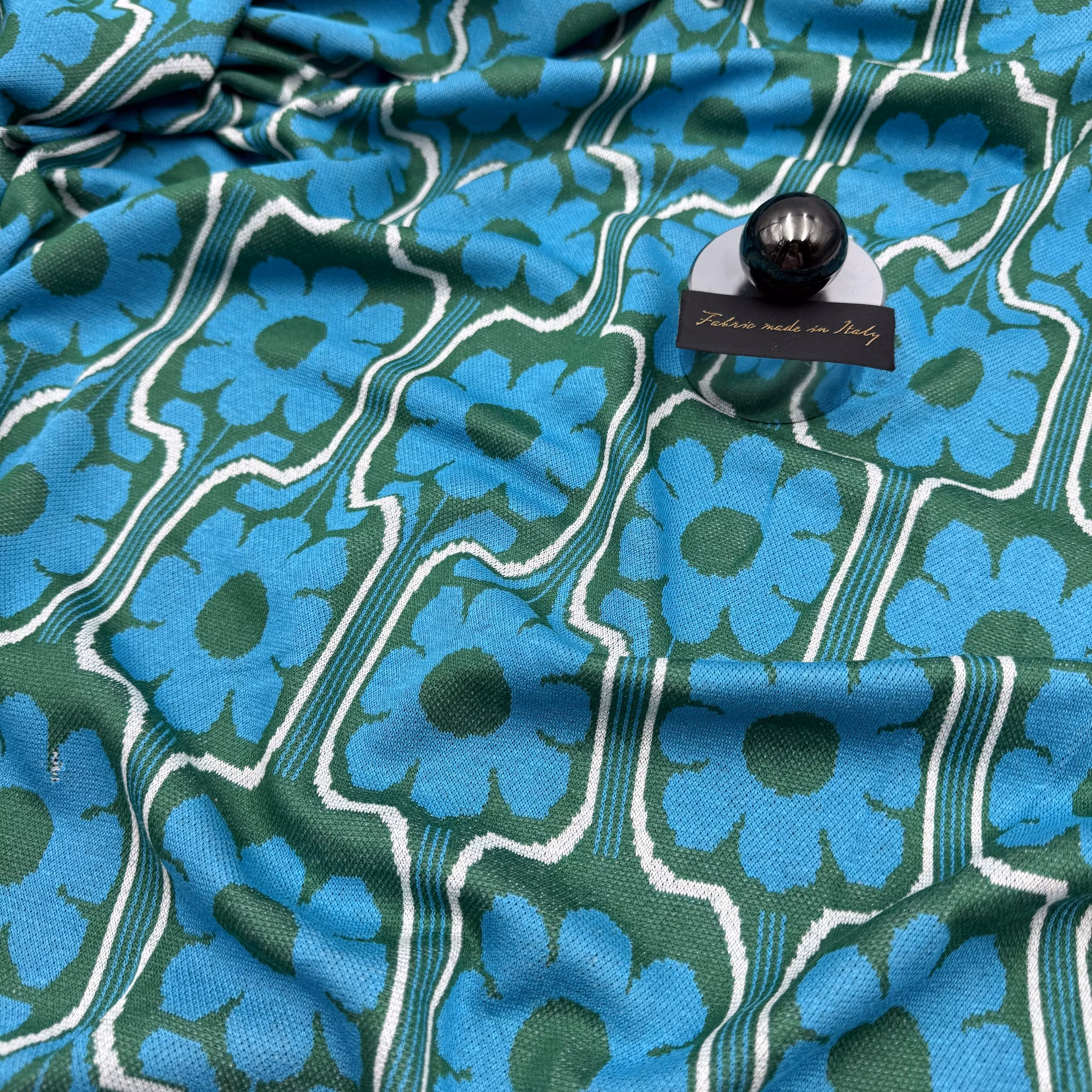 Färg: klargrön botten, blommönster i turkos och vitt.
