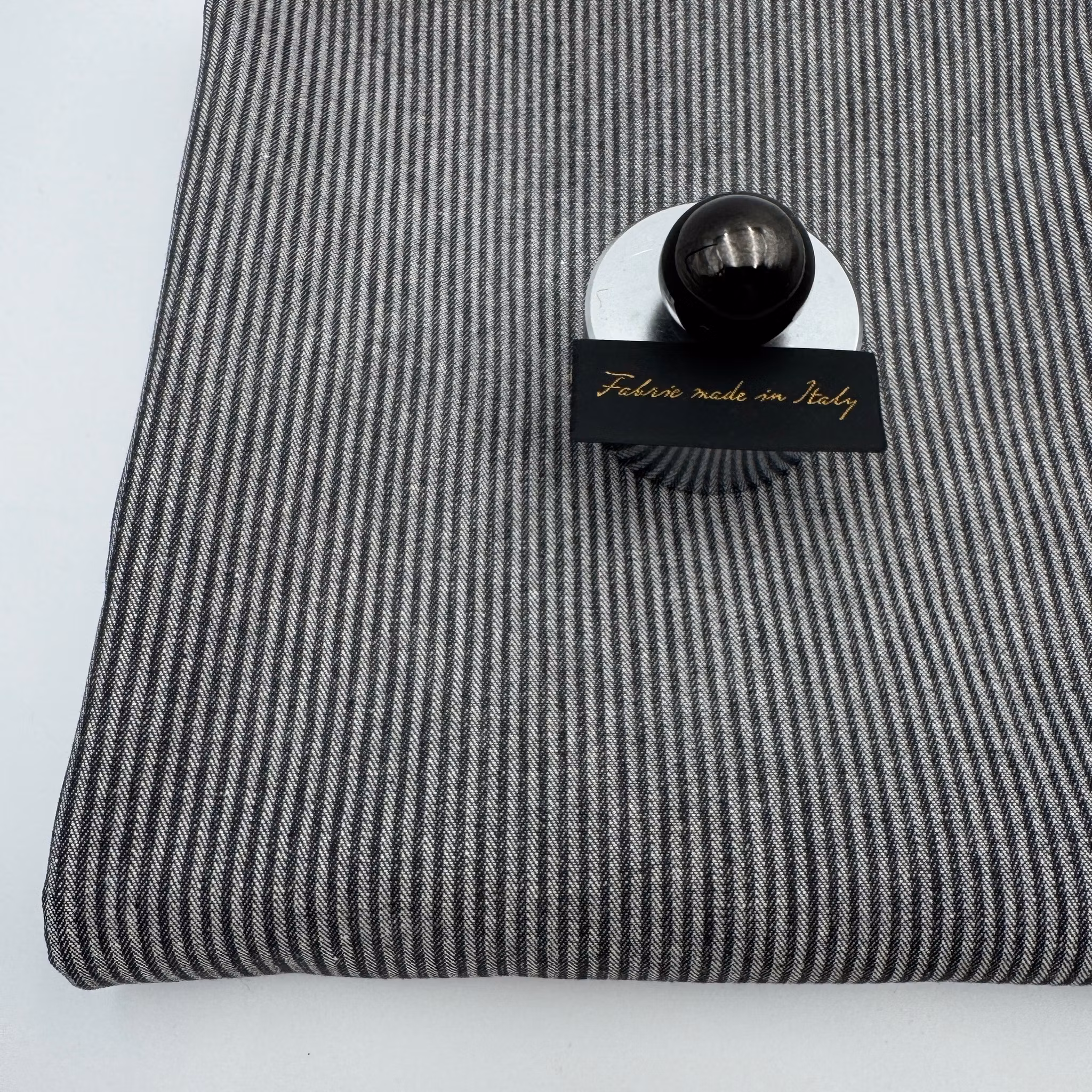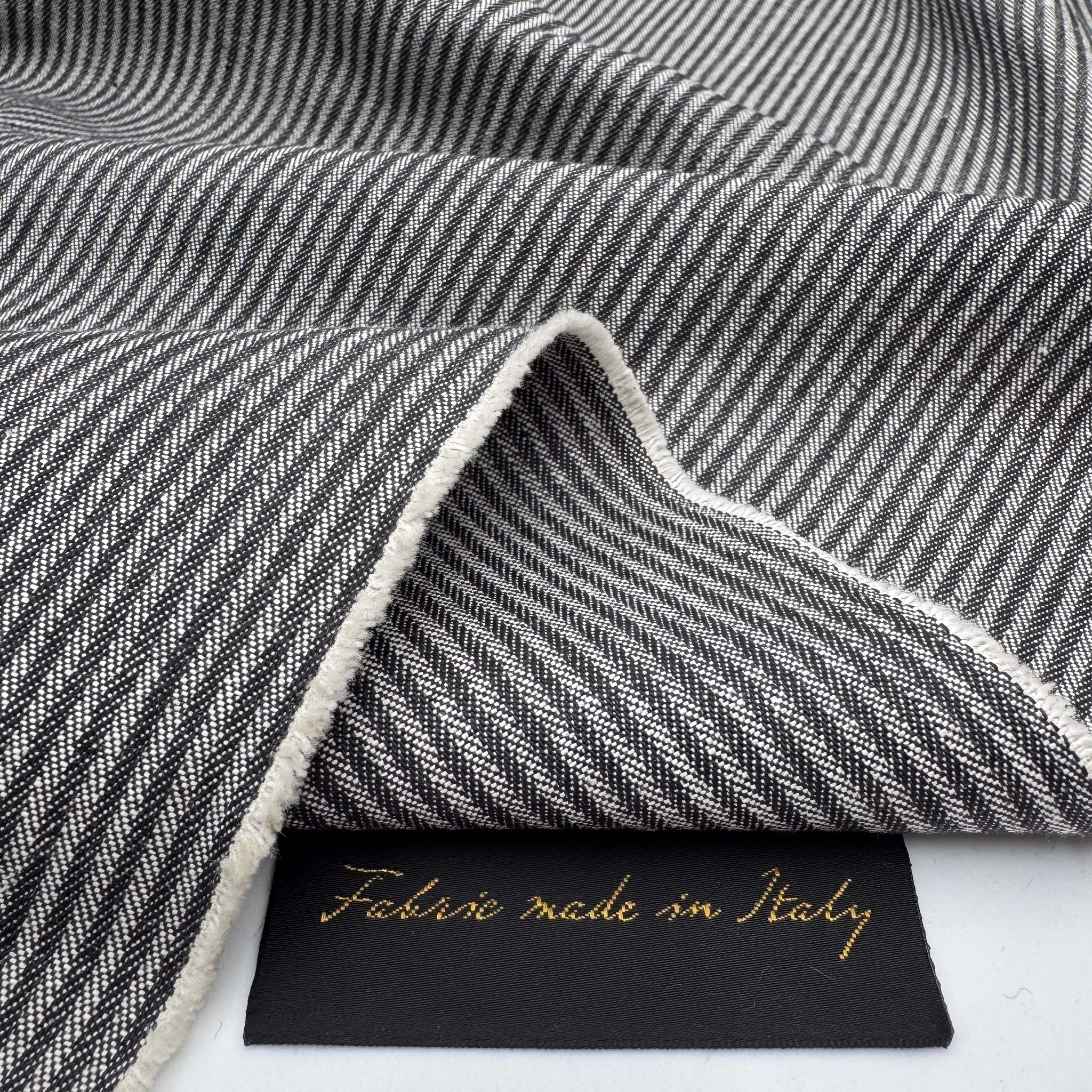 Material: 100% bomull, smala vävda fiskbensränder på längden, tänk smidig denim.