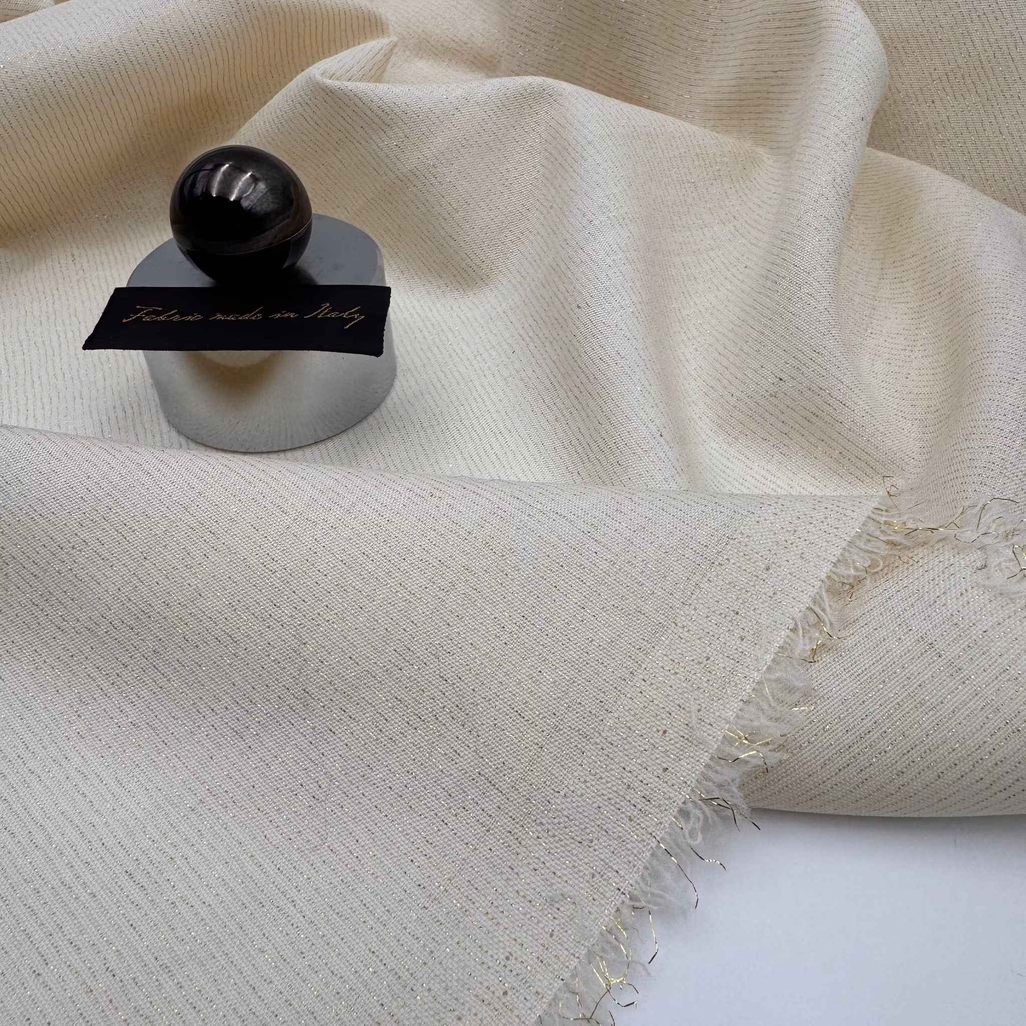 Material: Ull med diskreta guldtrådar på bredden. Tänk tunn kostymull. Faller fin och skrynklar inte.