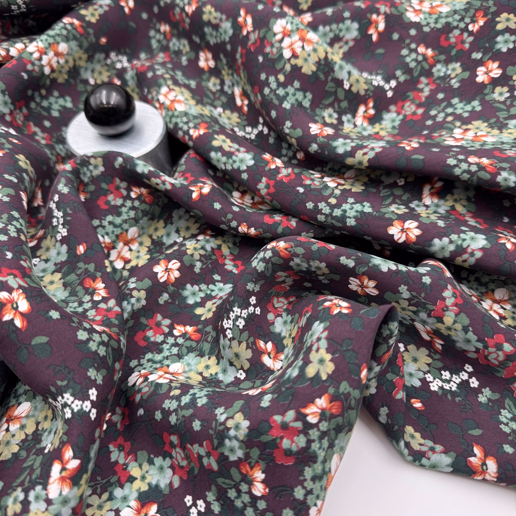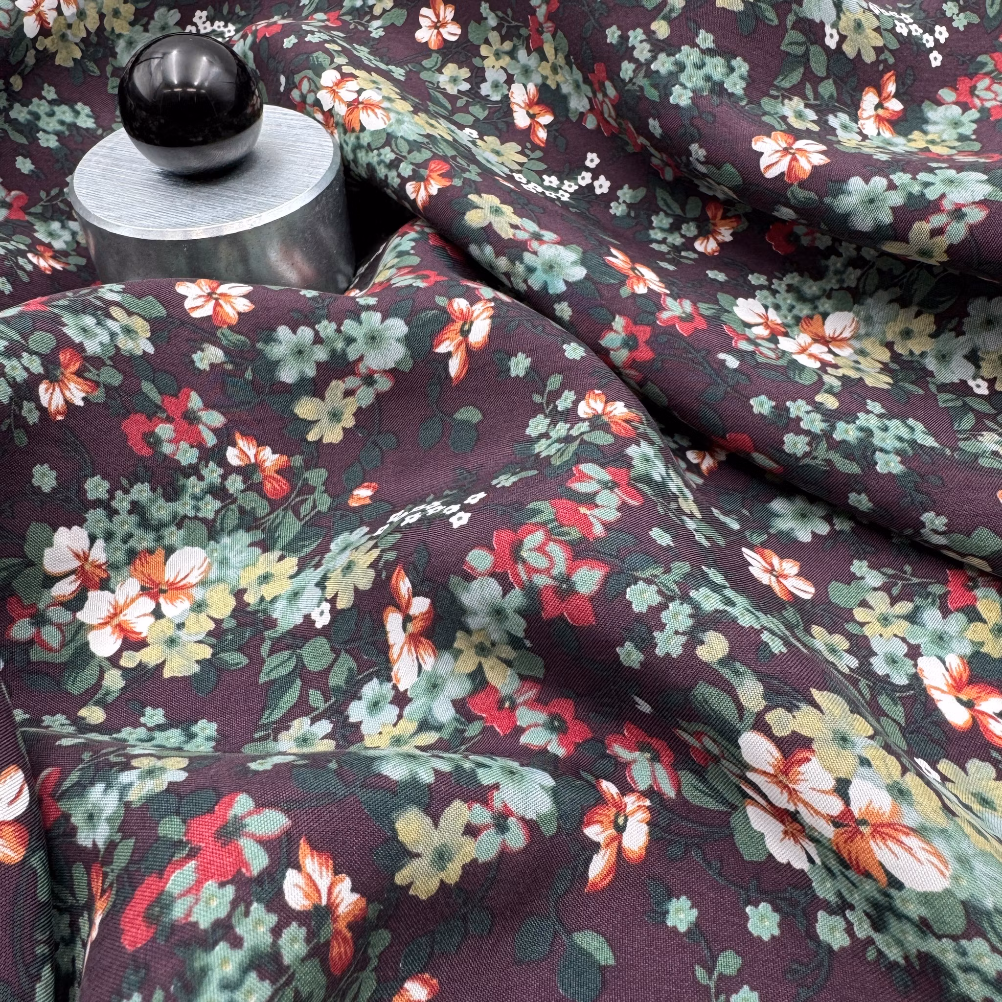 Färg: mörk vinröd botten, blommor i grågröna nyanser