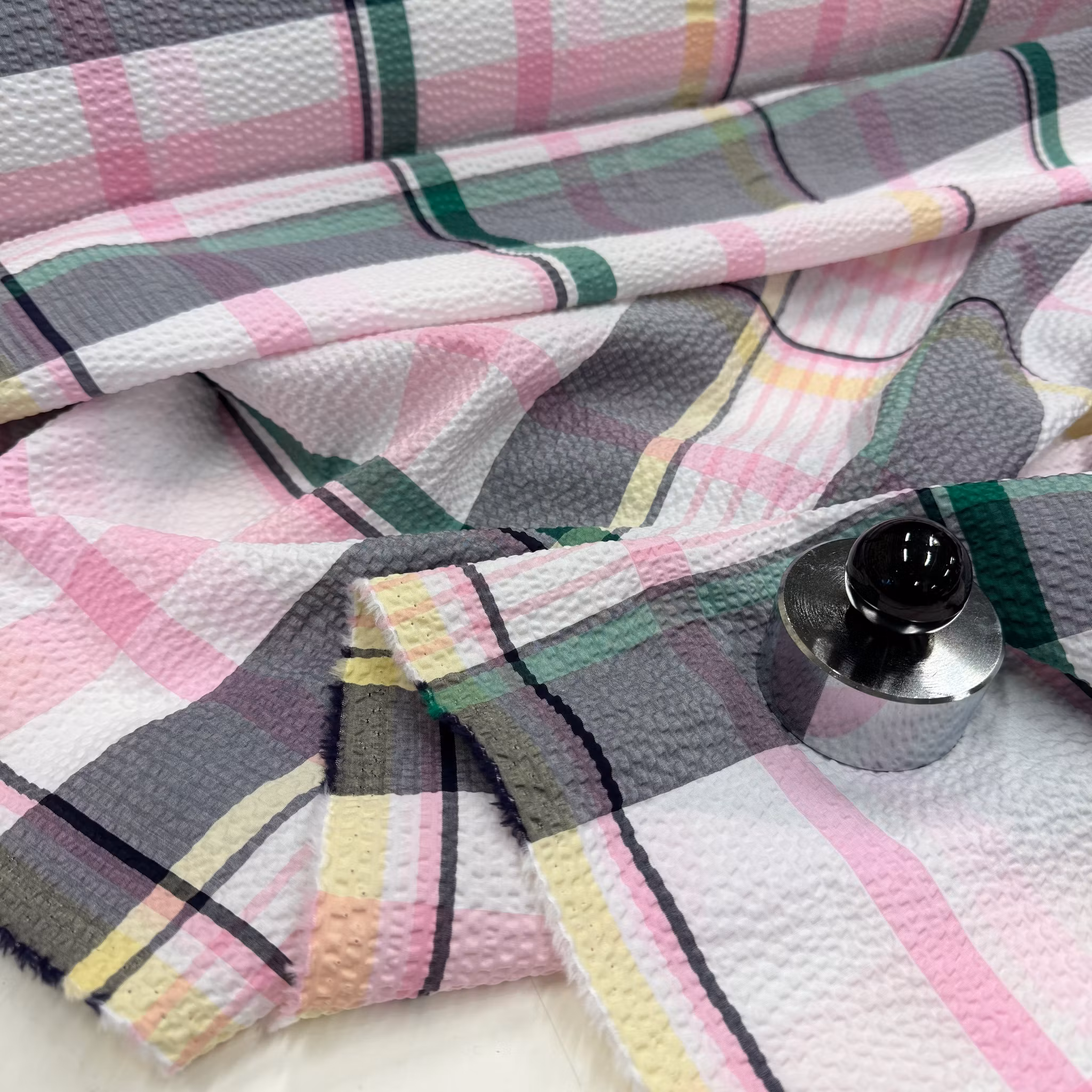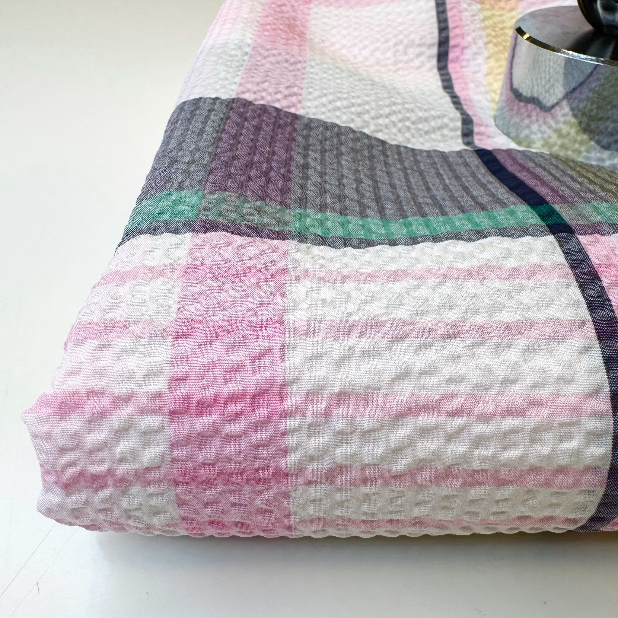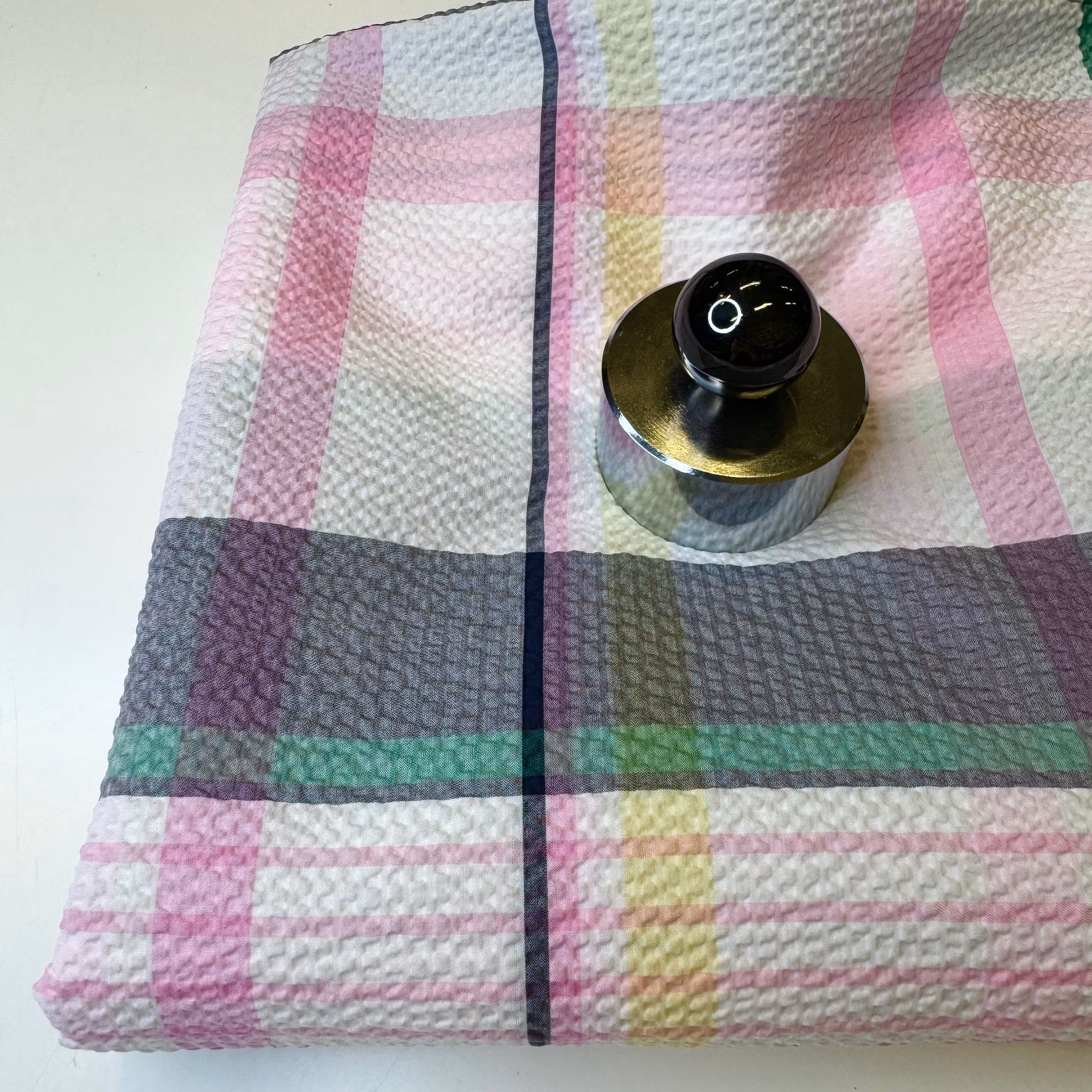 Färg: Vit botten och rutor i rosa, grönt, gult och lite svart.