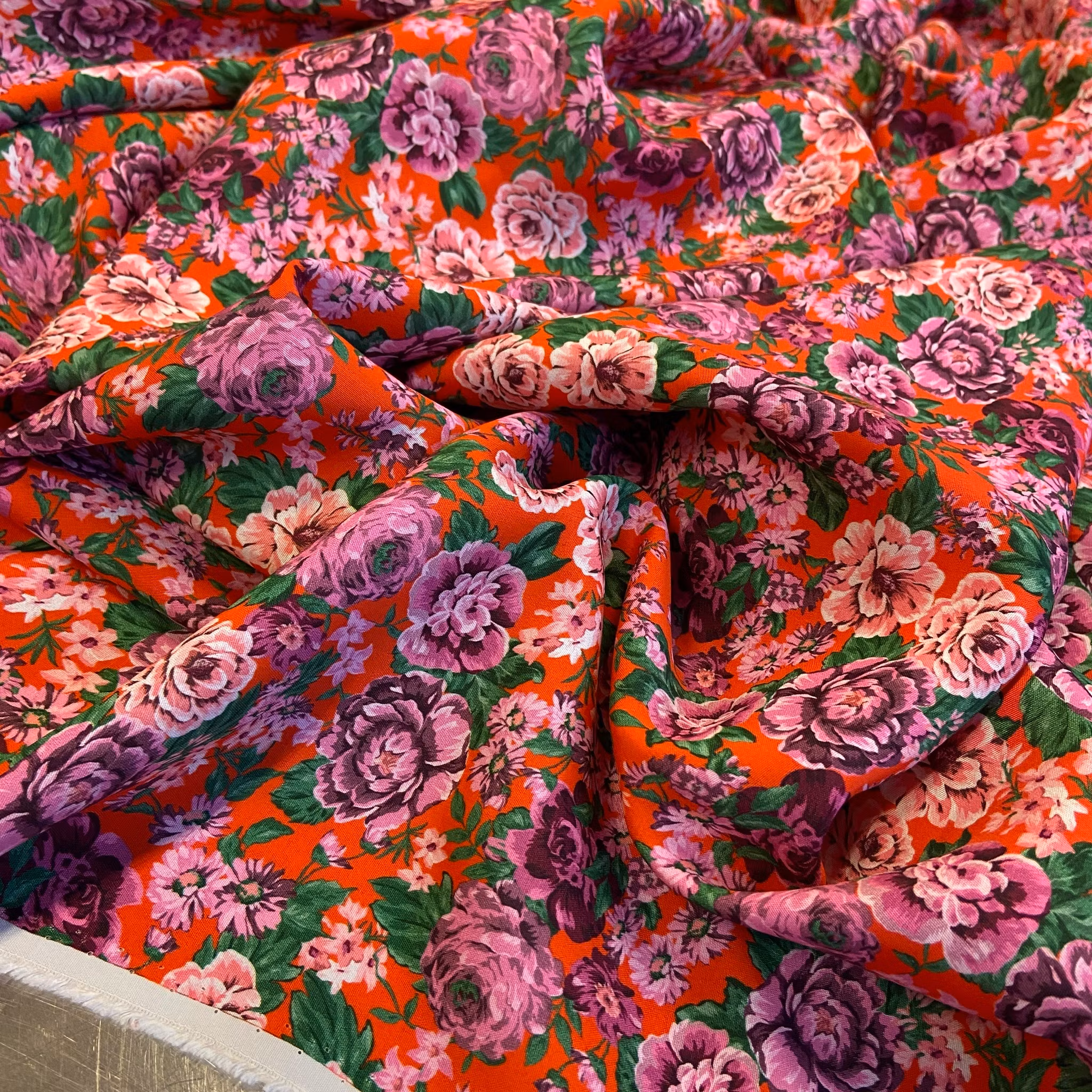 Färg: Ljusröd botten, blommor i rosa och lila.