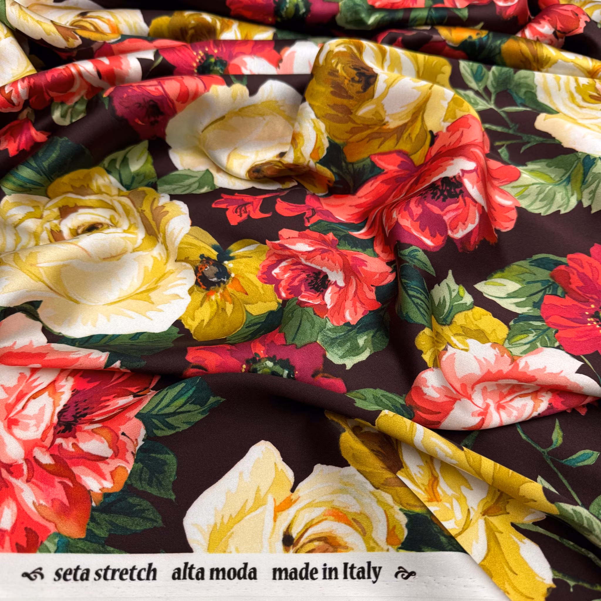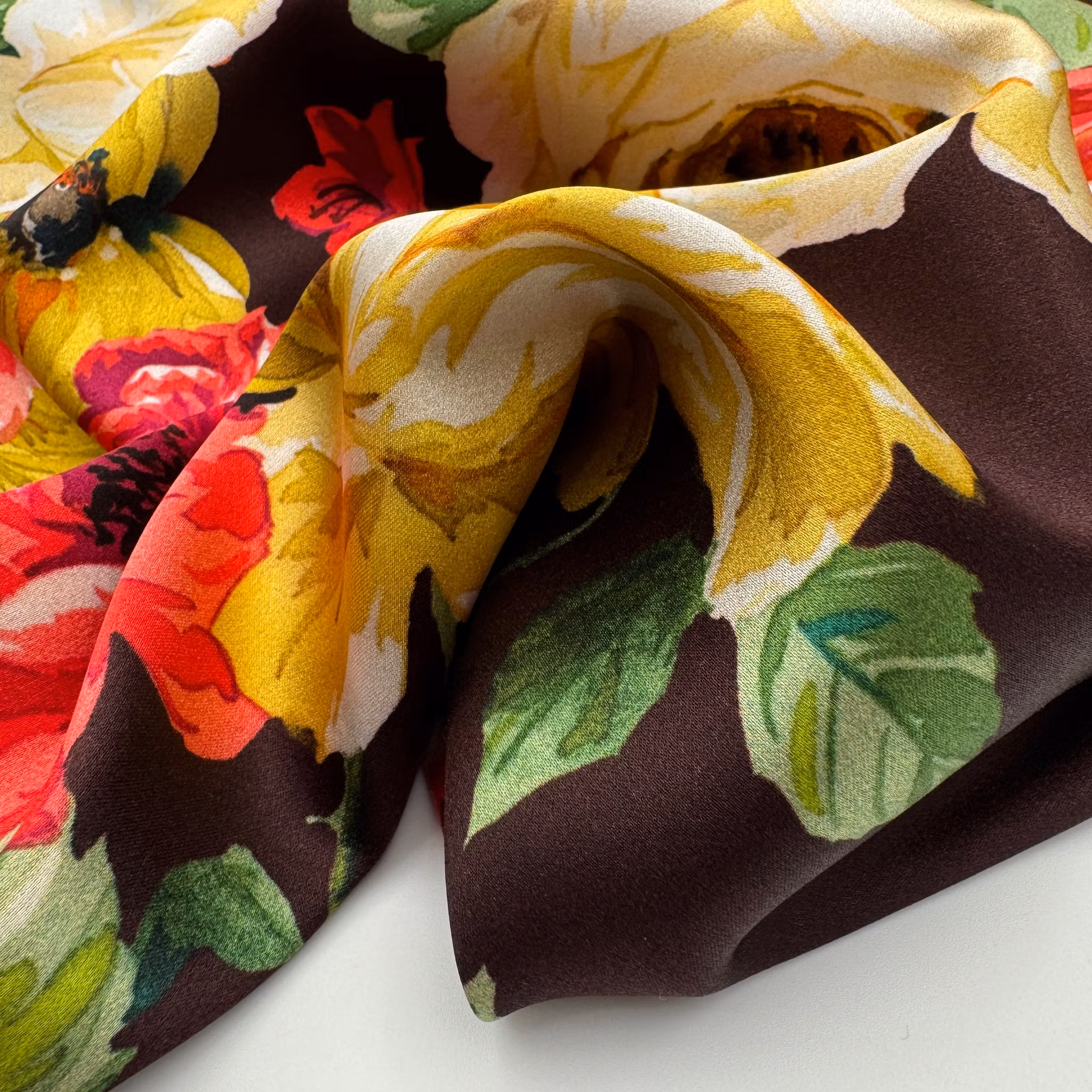 Färg: Varmbrun botten, blommor i lila, gult och hallonrött.