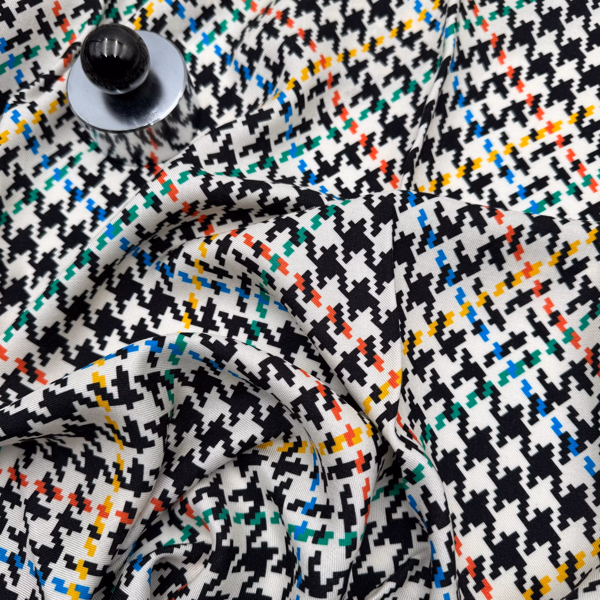 Färg: gräddvit botten, svarta hundtänder och rutmönster i klara färger.