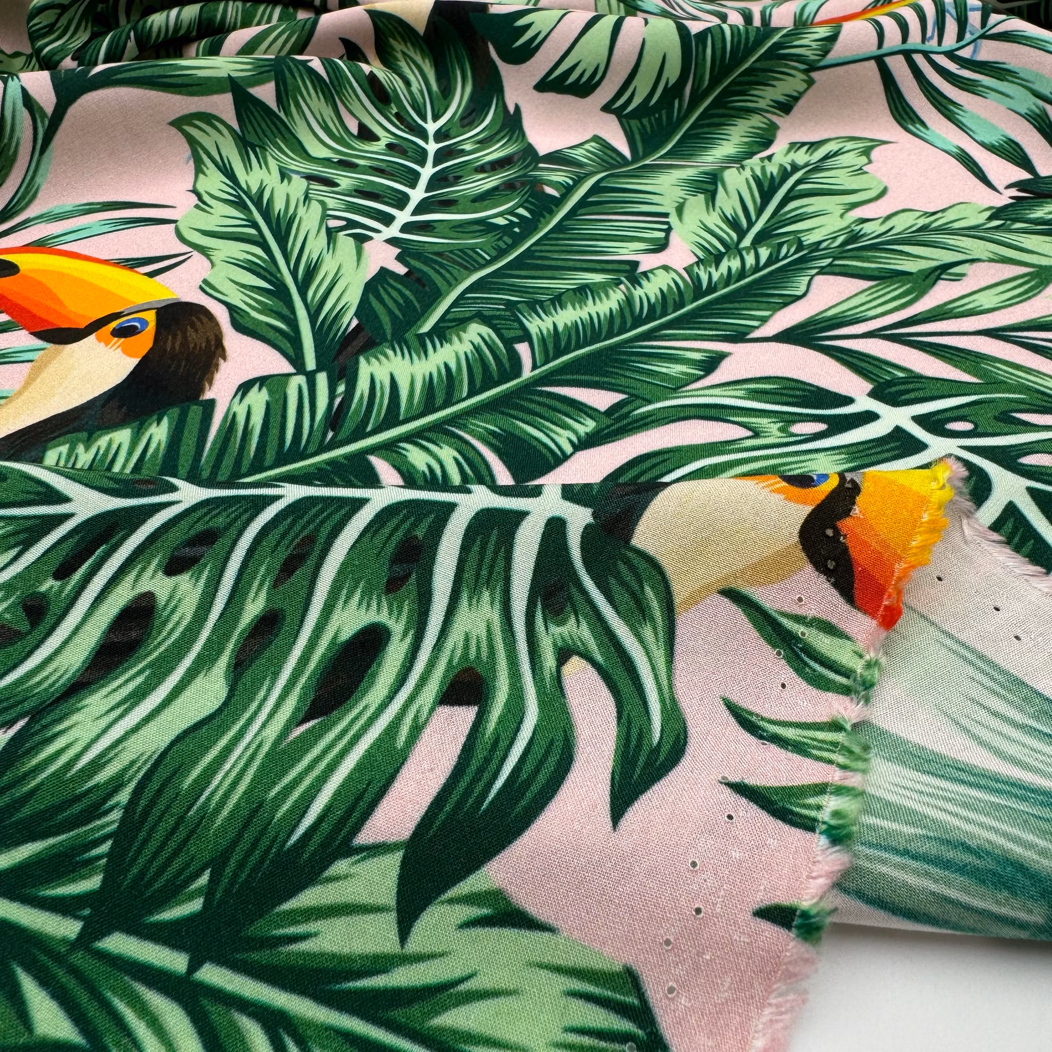 Färg: ljusrosa botten, gröna blad och färgglada näbbar som sticker fram.