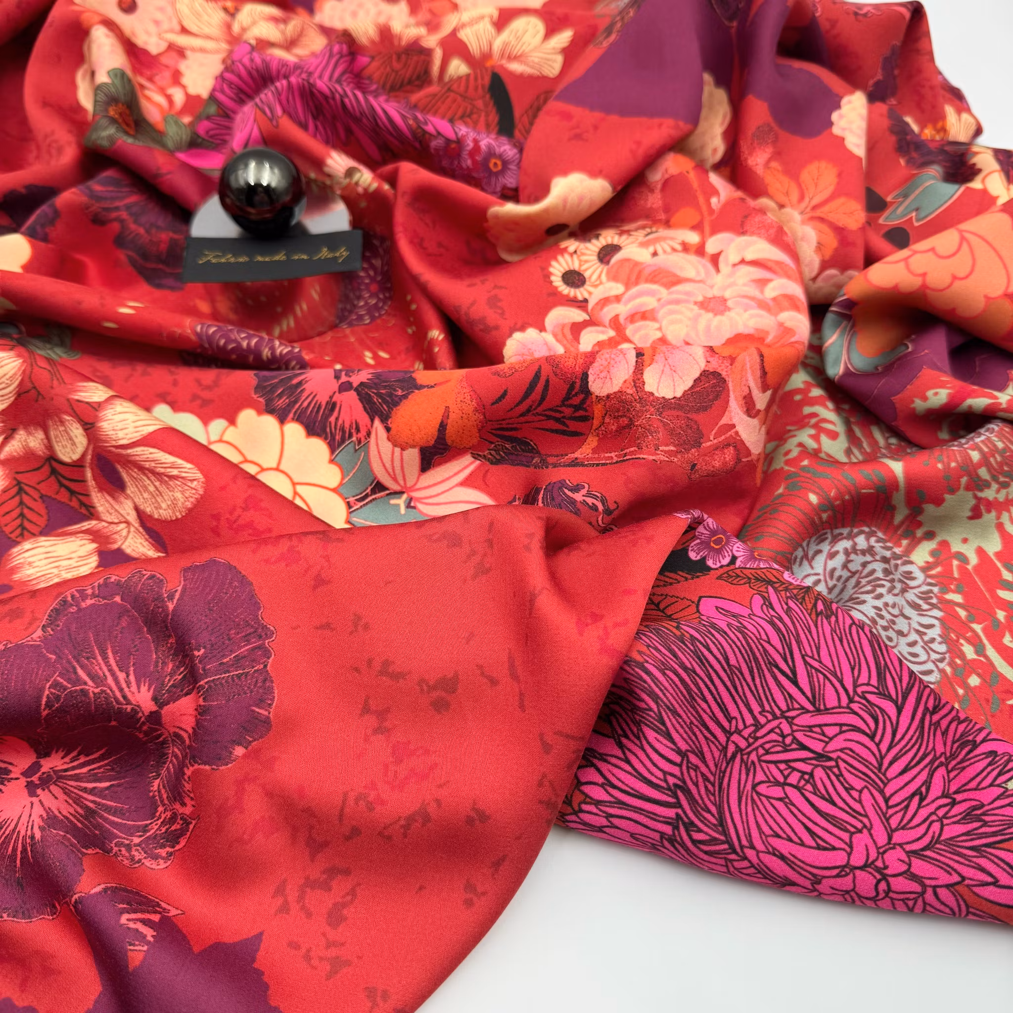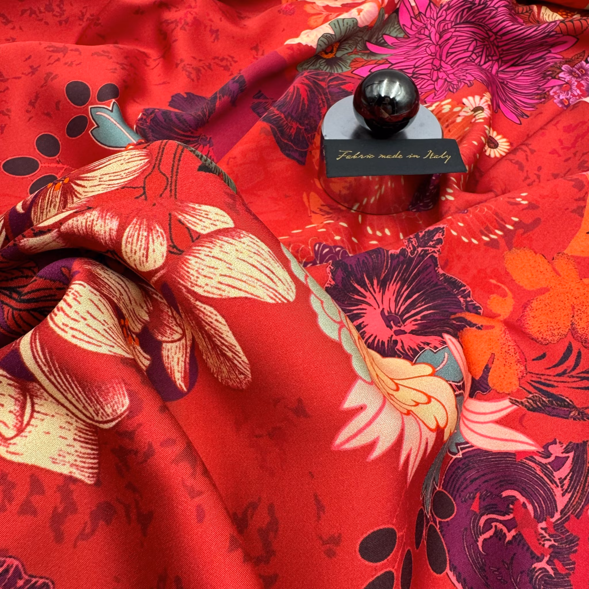 Färg: djup röd botten, blommor i rosa, mintgrönt och lila. Även lite rost och ljusblått