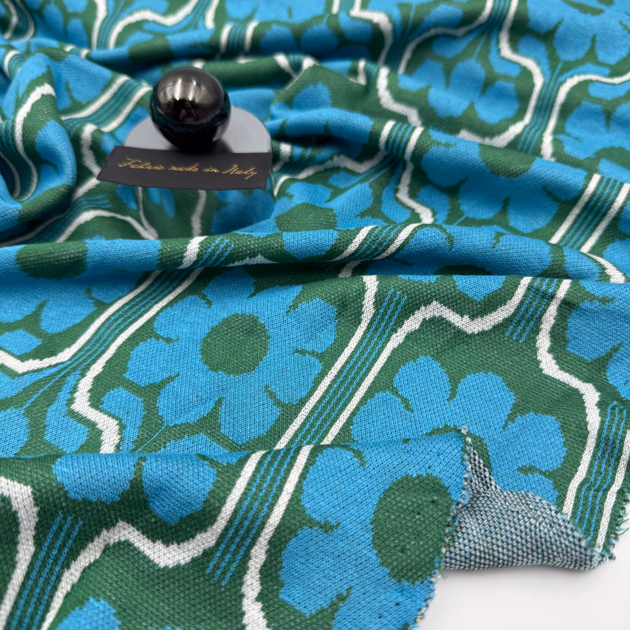 Färg: klargrön botten, blommönster i turkos och vitt.