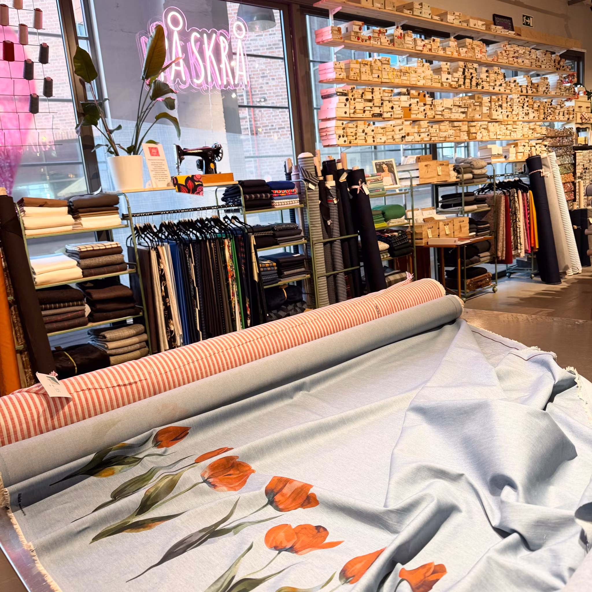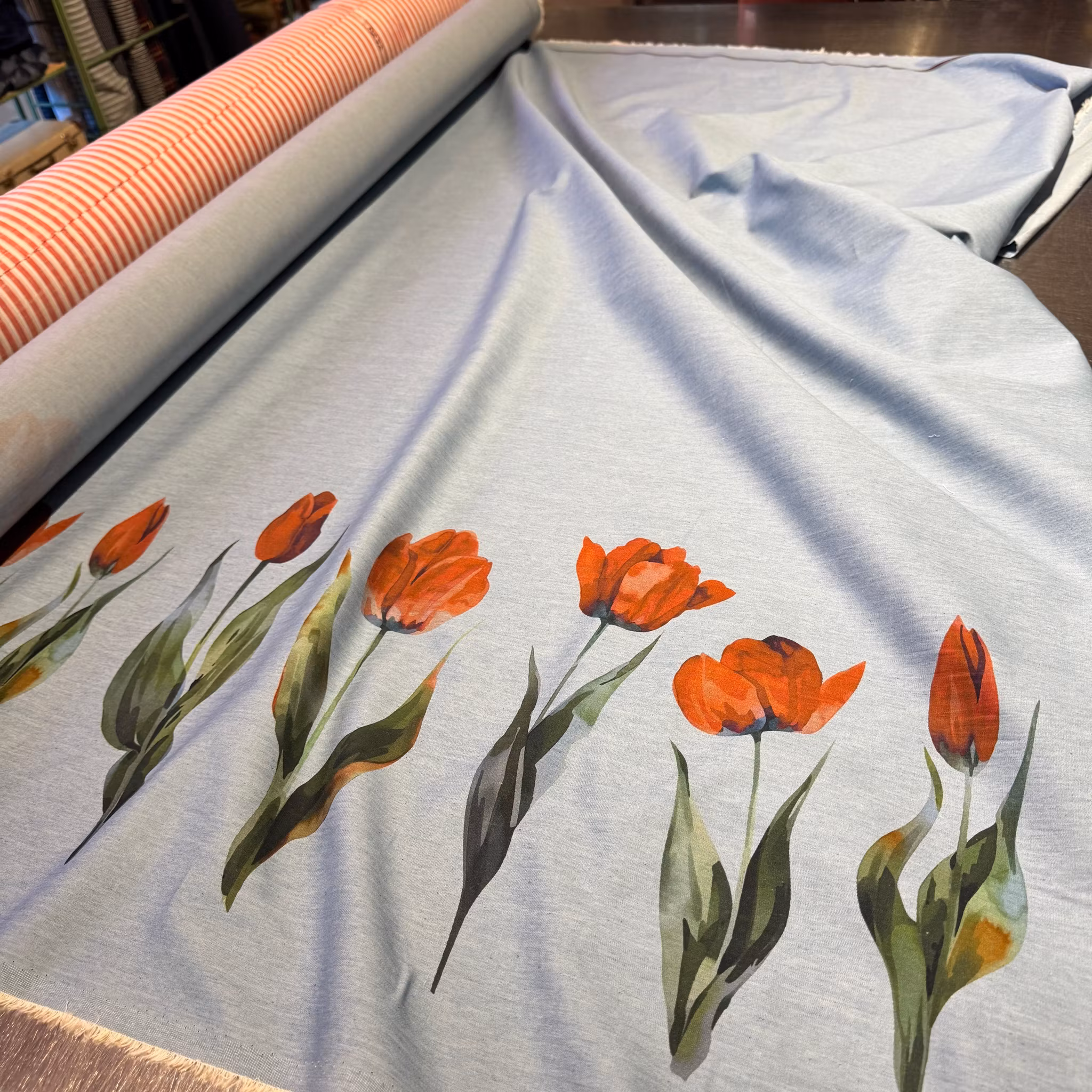Färg: ljus jeansblå botten med trycka tulpaner längs ena kanten, trycket är ca 40cm högt och löper längs hela tyget.