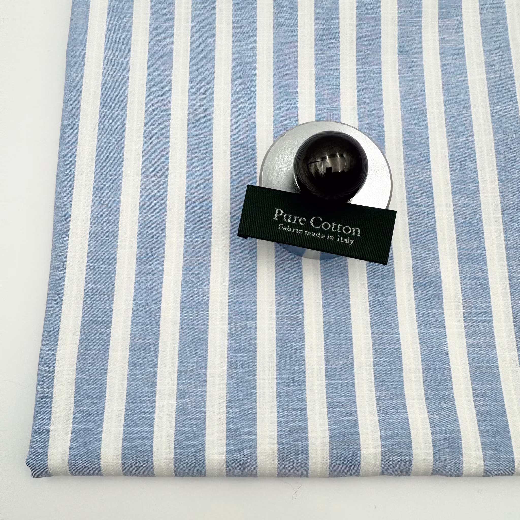 Färg: Ljusblå chambray med vita ränder på längden. Ränderna har i sin tur lite strukturränder i sig. Effektfullt men diskret.