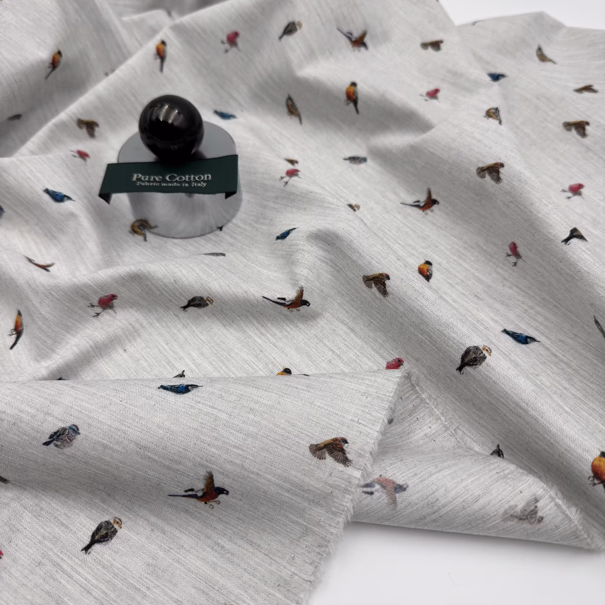 Färg: ljusgrå botten, små fåglar i olika färger.