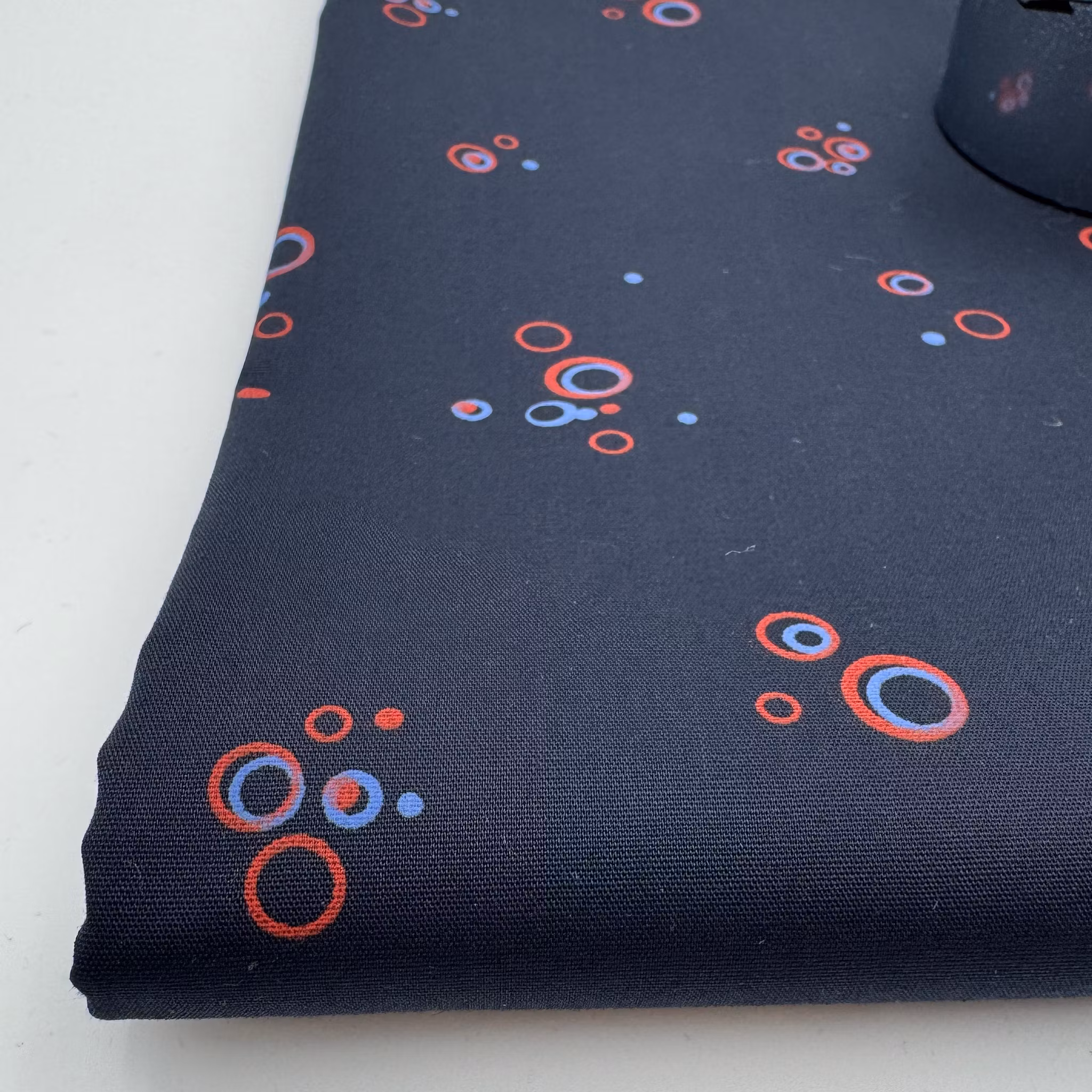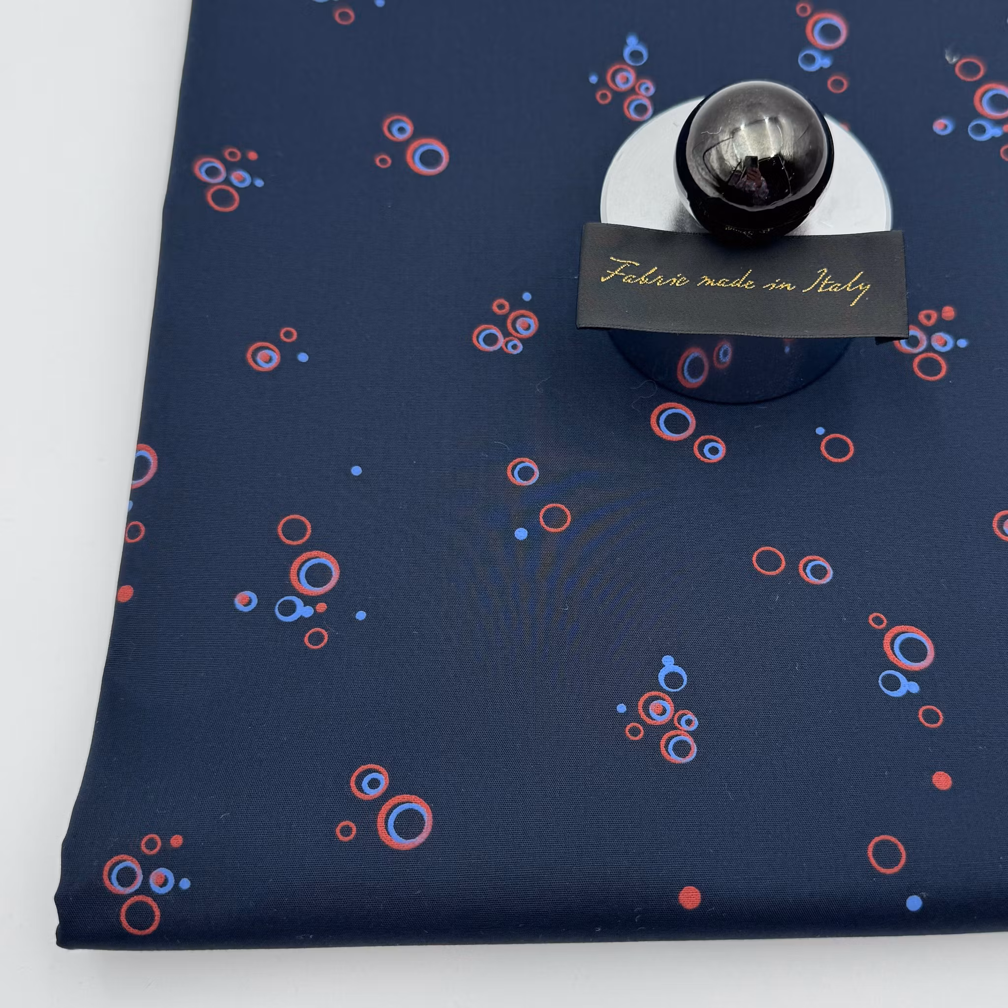 Färg: Marin botten, tryckt bubbelmönster i rött och blått.