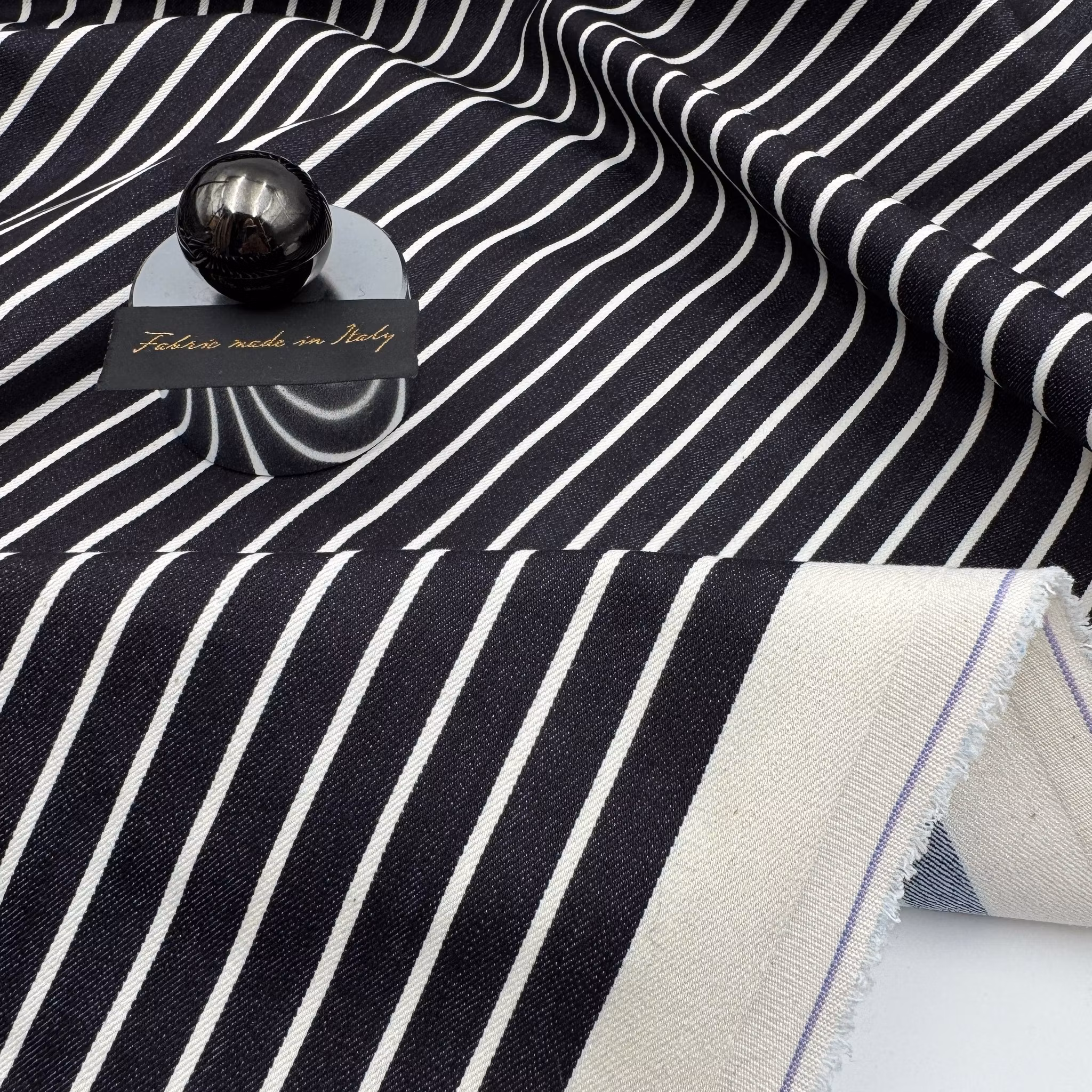 Färg: Mörkt jeansblå med vita ränder på längden. Det är knappt 1,5cm mellan ränderna.