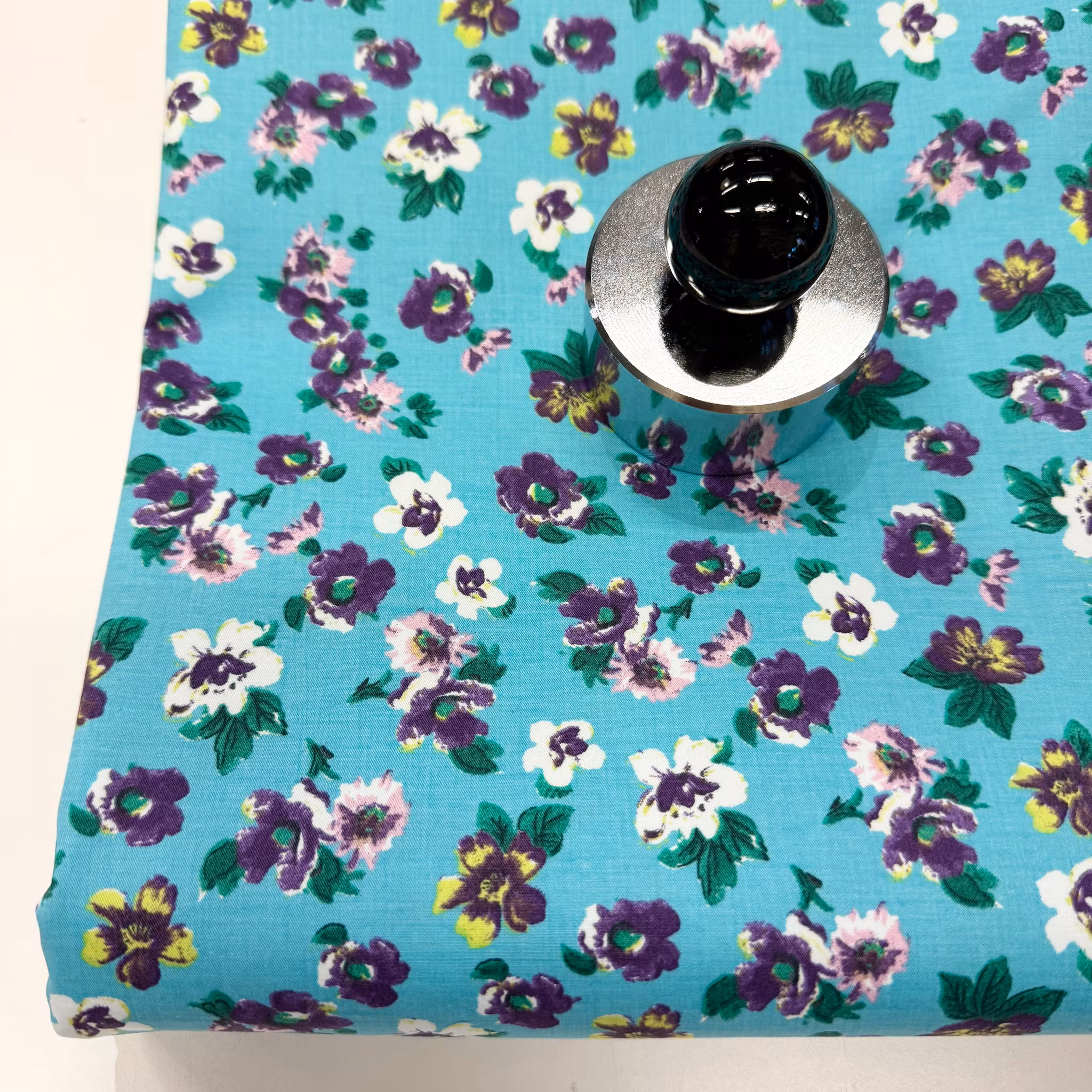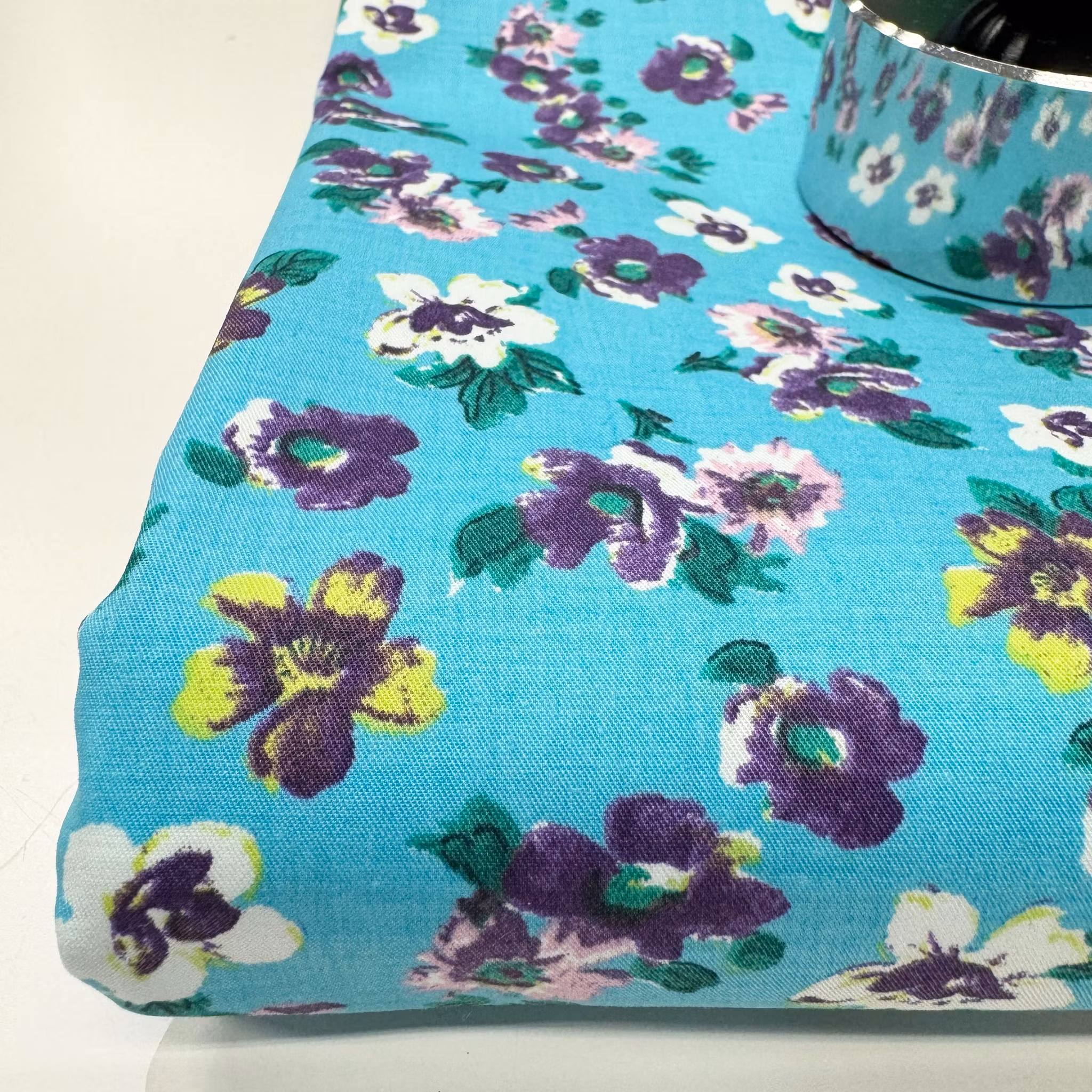 Färg: Turkos botten, lila och rosa blommor. Vita och gulgröna inslag.