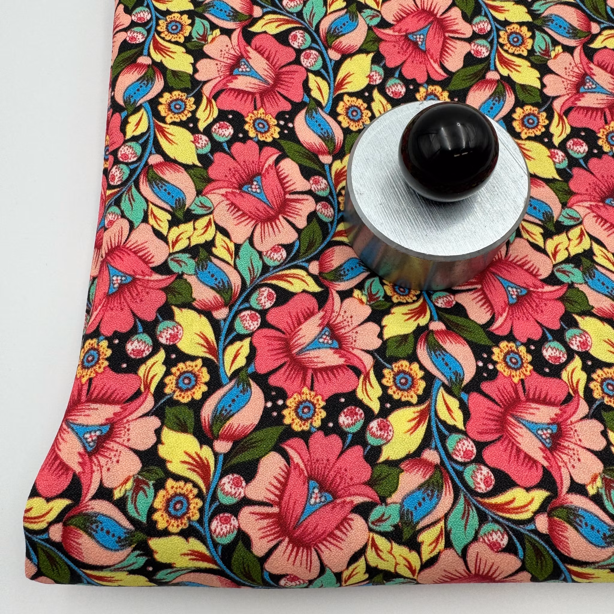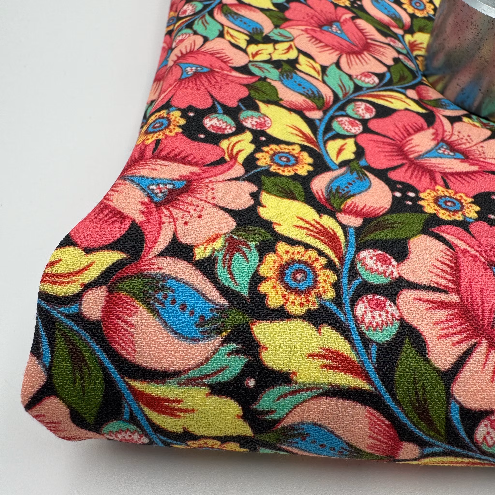 Färg: Svart botten, blommor i rosa, gult, mint, grönt och blått. Lite retrokänsla.