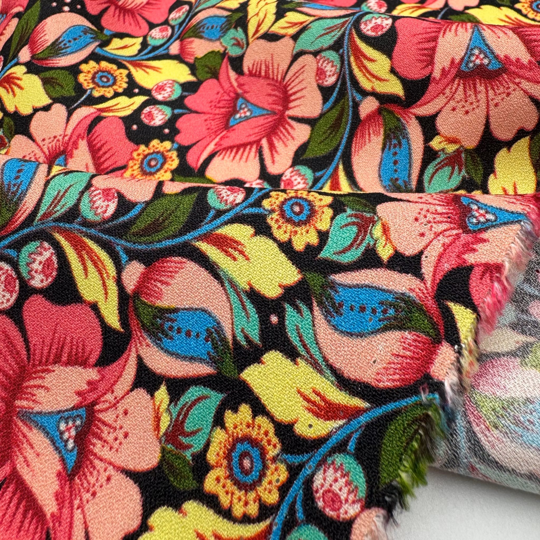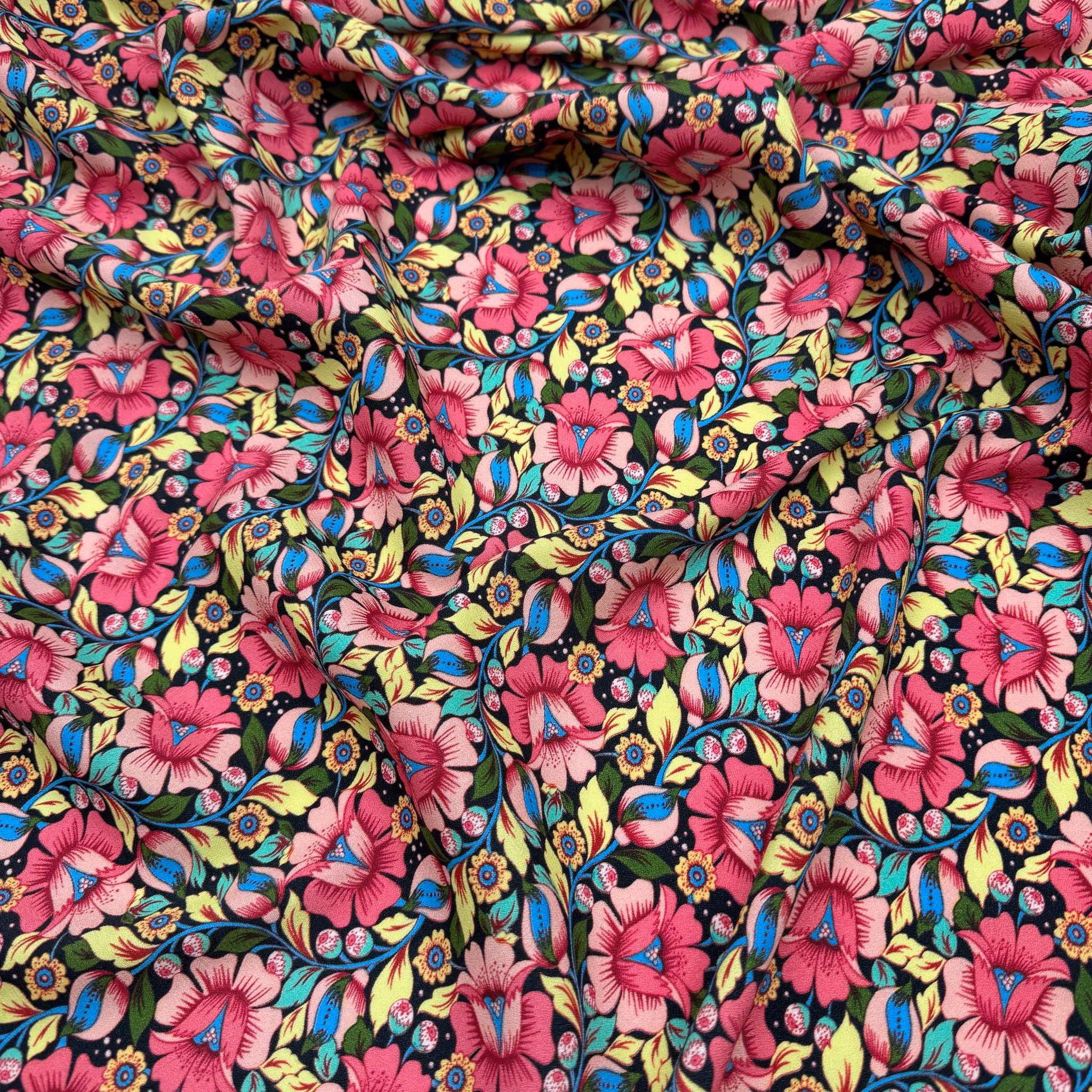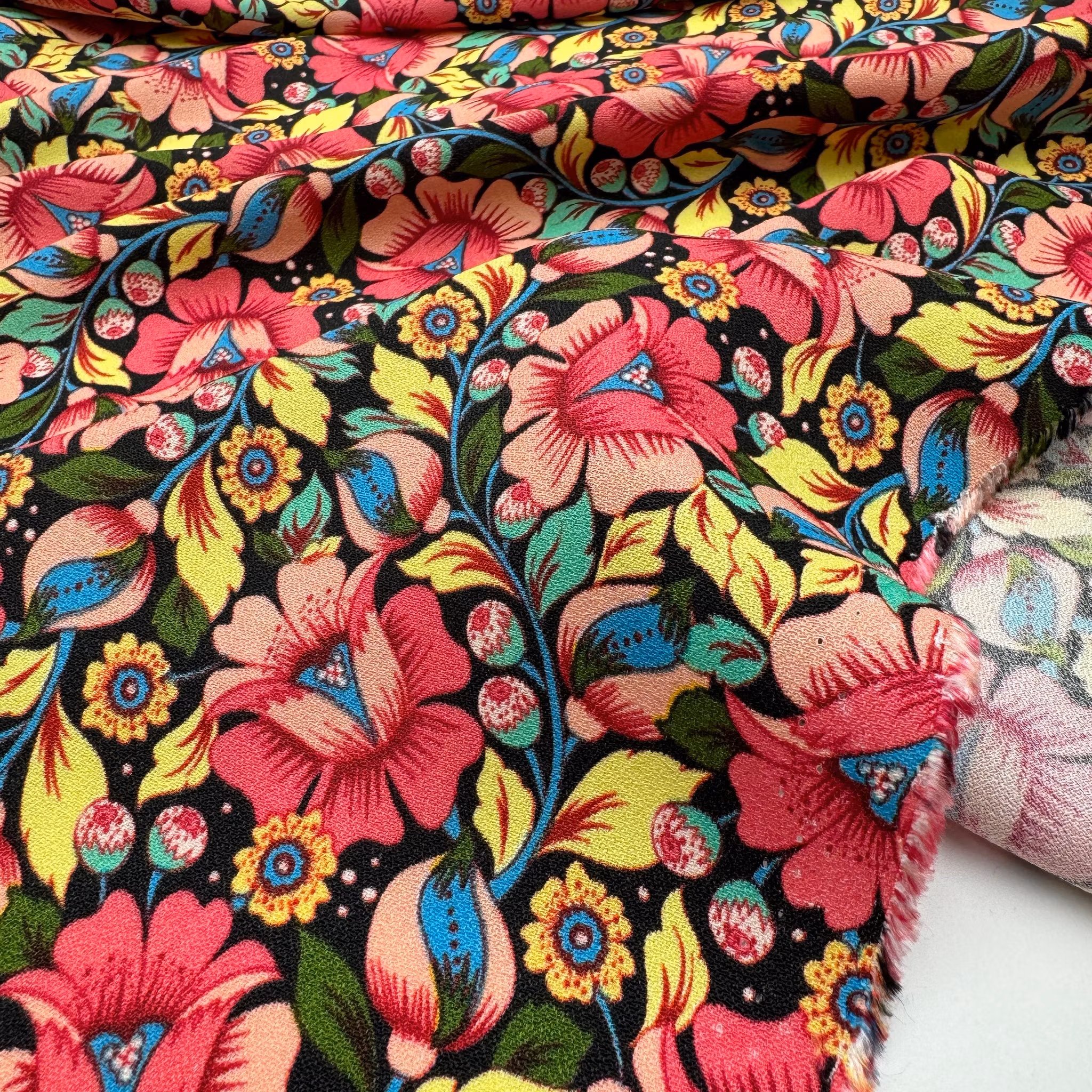 Viskoscrêpe rosa/gul blommig