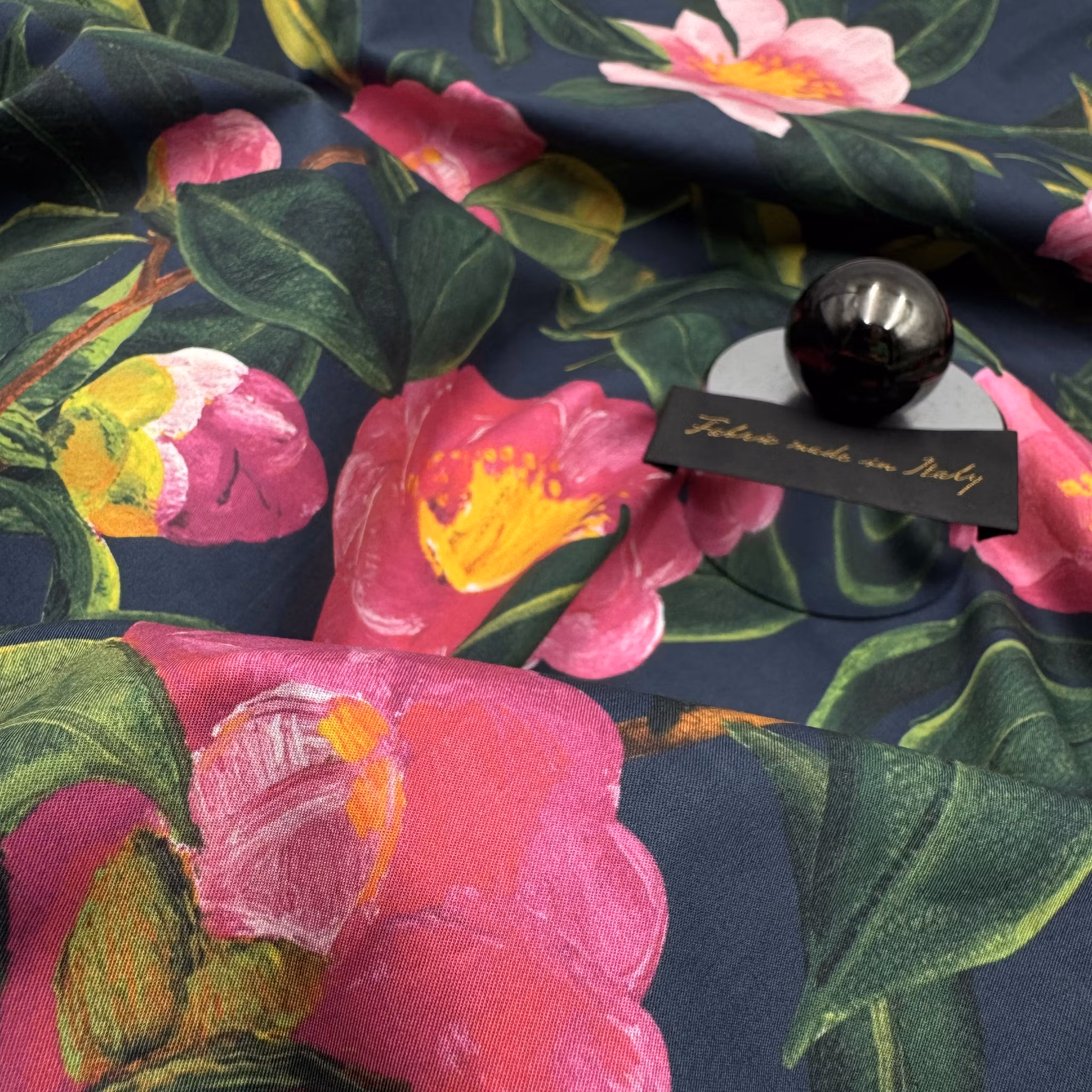 Färg: Marinblå botten, nyponrosor i cerise och rosa. Färgerna på blommorna blir ljusare närmare slutet på panelen.