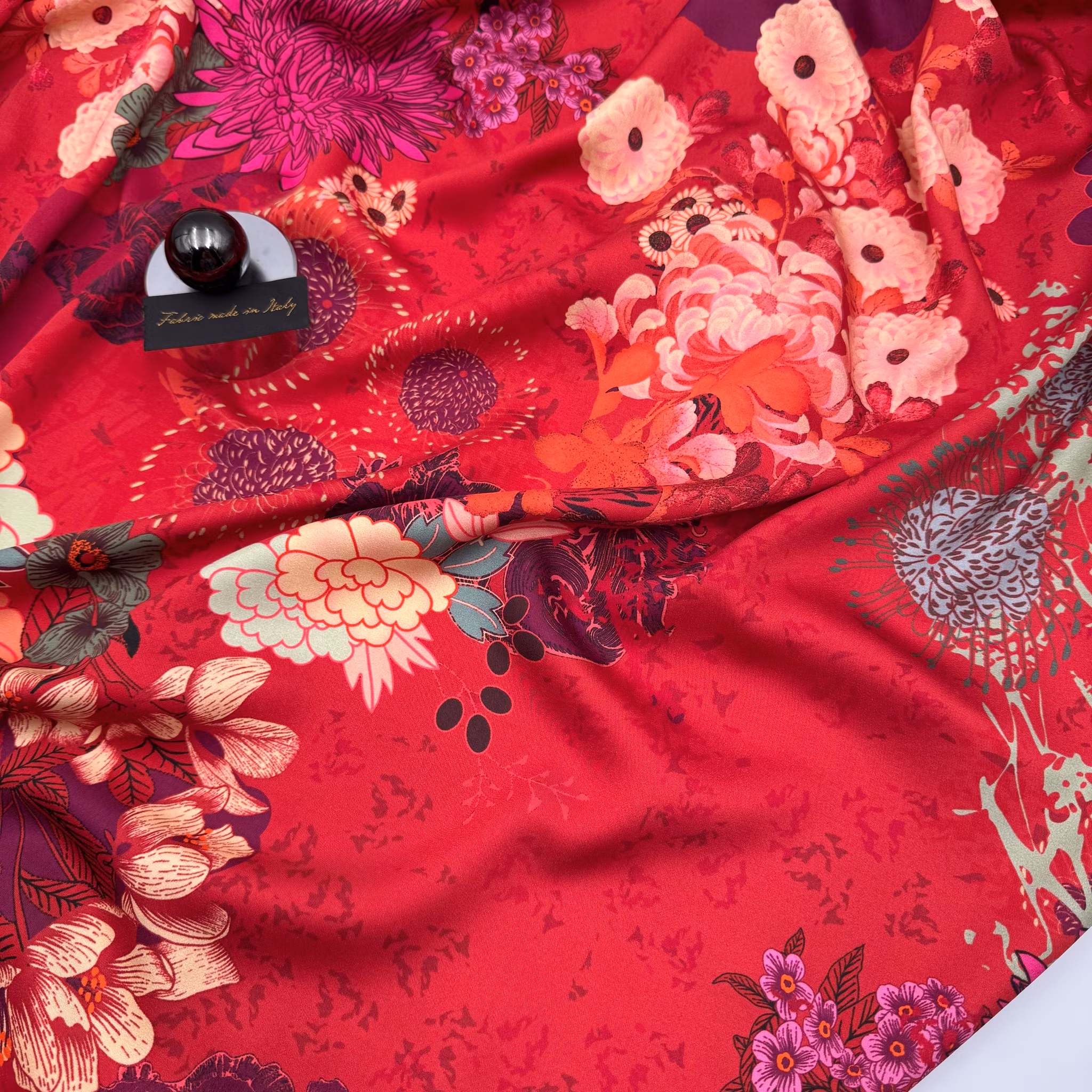 Färg: djup röd botten, blommor i rosa, mintgrönt och lila. Även lite rost och ljusblått