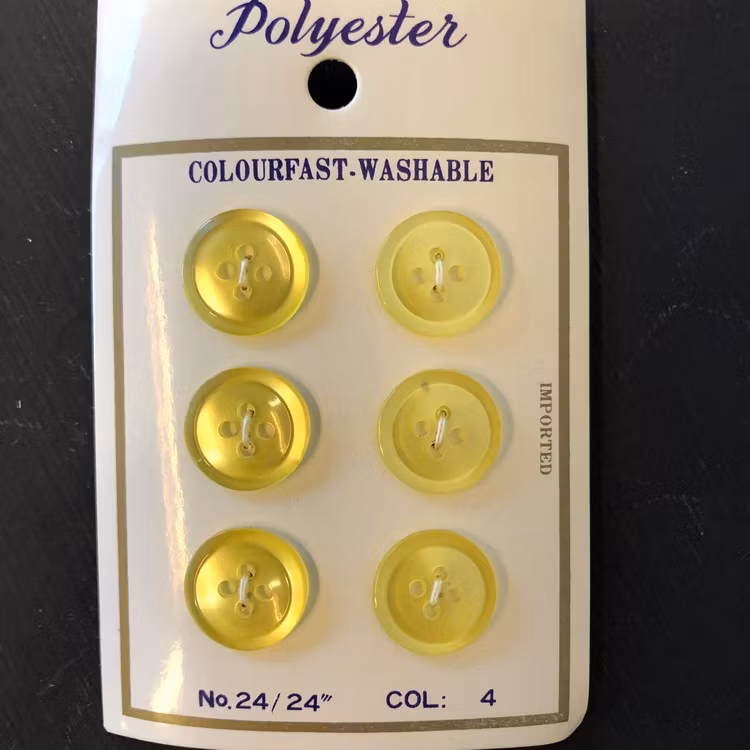 Vintageknappar, 40-60-tal. 6 st ljusgula, skimrande plastknappar på karta. 15 mm i diameter. Pris per karta.