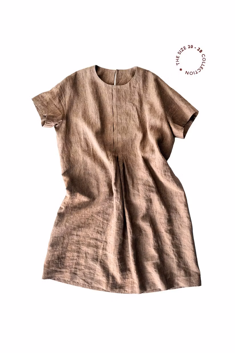 Rak klänning med mycket vidd och fina veck fram. Välj enfärgat tunt linne. Engelska storlekar 20-28, där 20 motsvarar ca storlek 48. Bra och tydliga beskrivningar med bilder steg för steg.