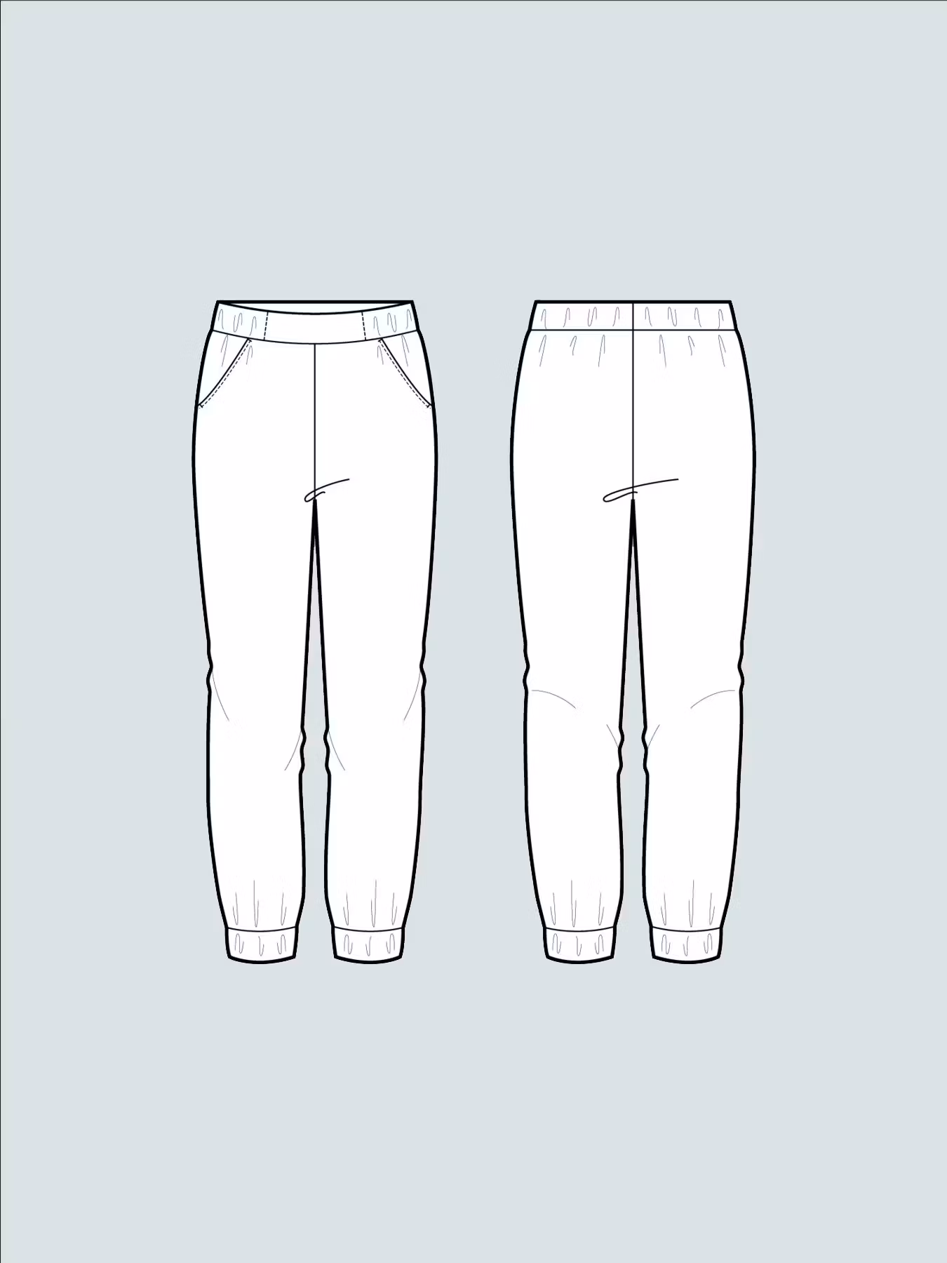 Det perfekta byxmönstret! Resårlinning och resår i benslut. Fickor fram. Variera benlängd efter behag. Passar alla möjliga vävda tyger; denim, linne eller något roligt retrotyg. Lite stadigare trikå funkar också.