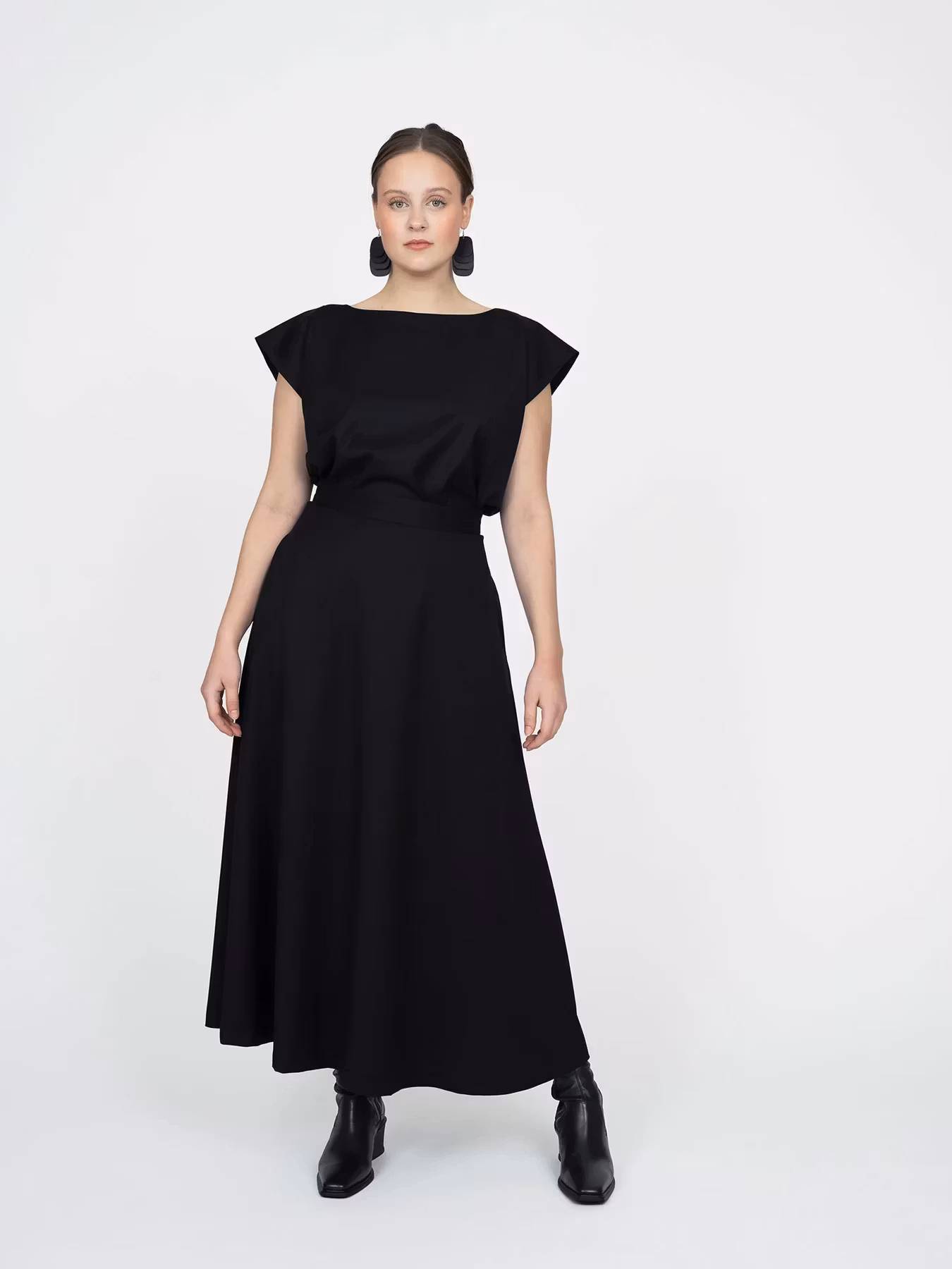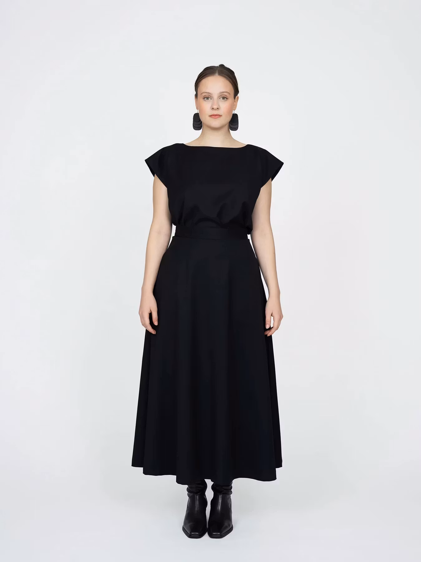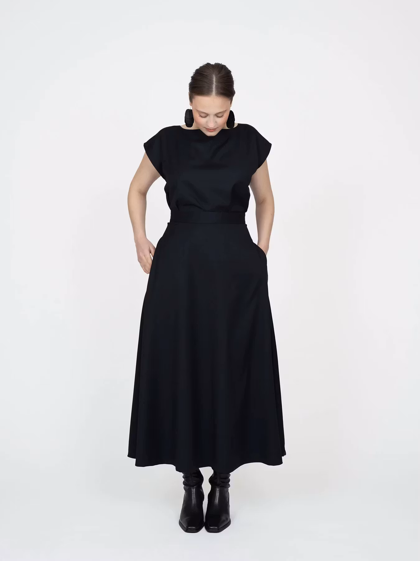 The Balloon Skirt is a midi-length skirt featuring a flared silhouette, a straight waistband, a concealed zip closure at the back, and side seam pockets. Designed for versatility, this skirt offers two style options: with or without the distinctive balloon effect.