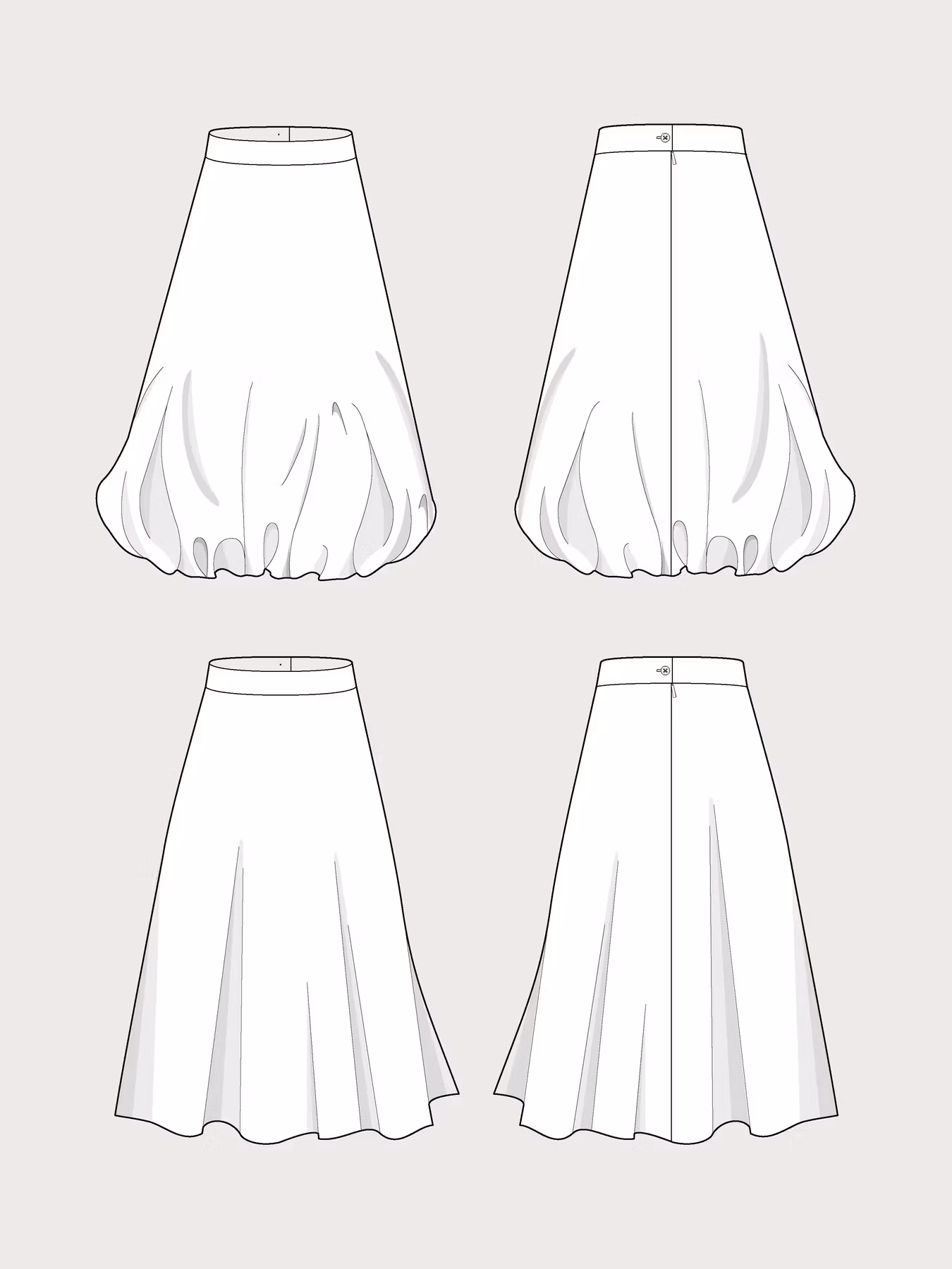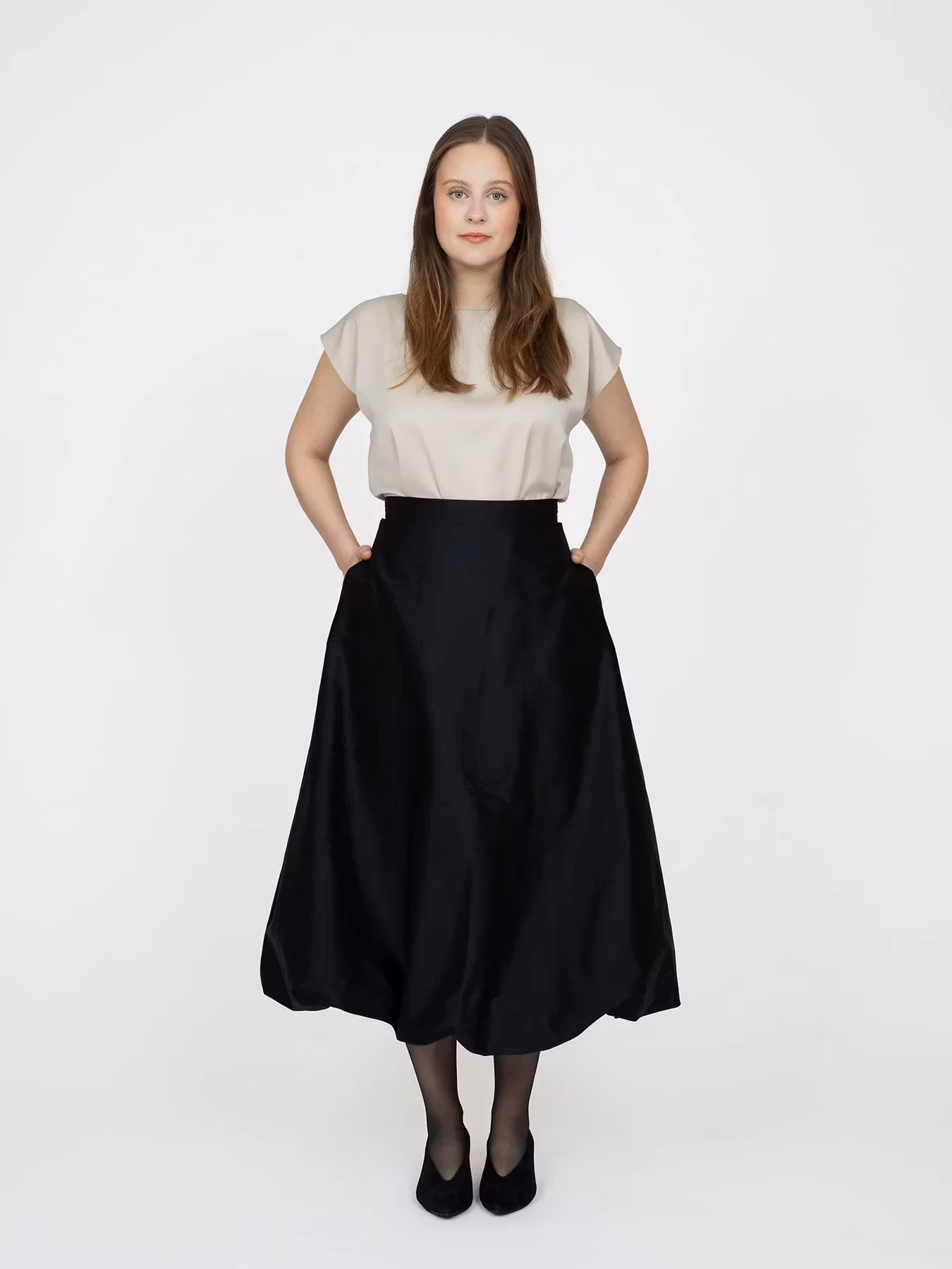 Ballongkjolen är en midi-lång kjol med utsvängd siluett, ett rakt midjeband, en dold dragkedja baktill och sidosömsfickor. Den här kjolen är mångsidig och erbjuder två stilalternativ: med eller utan ballongeffekten.