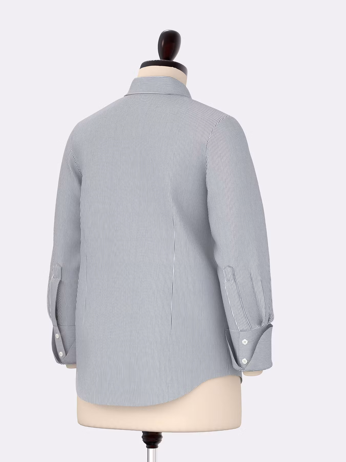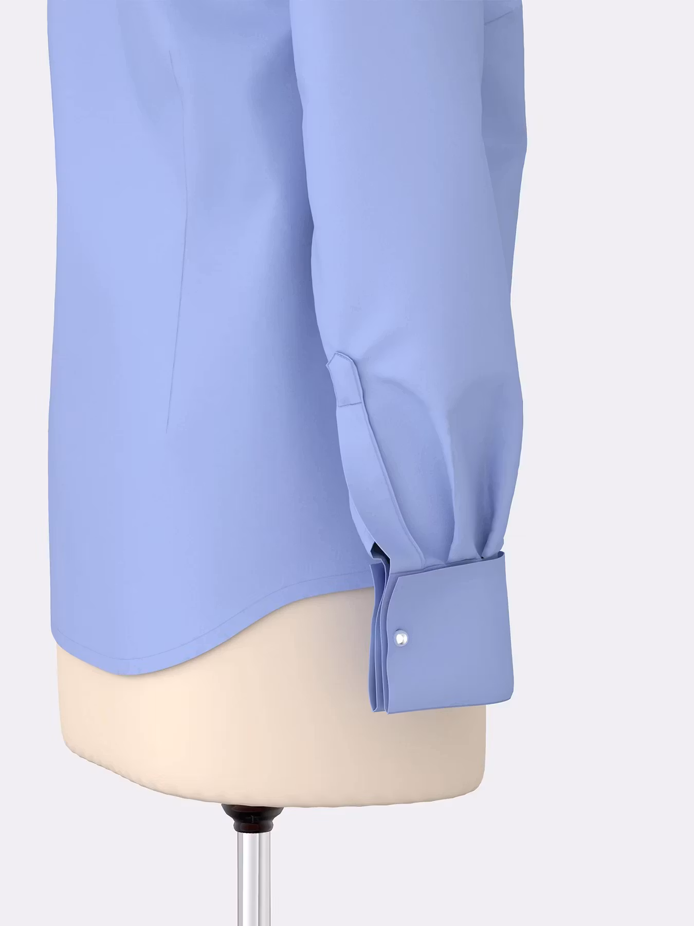 Skjortan har en karakteristisk hög manschett med två knappar, och för extra mångsidighet ingår dessutom två eleganta dubbla manschetter: en rundad modell och en som är avsedd att bäras med manschettknappar.