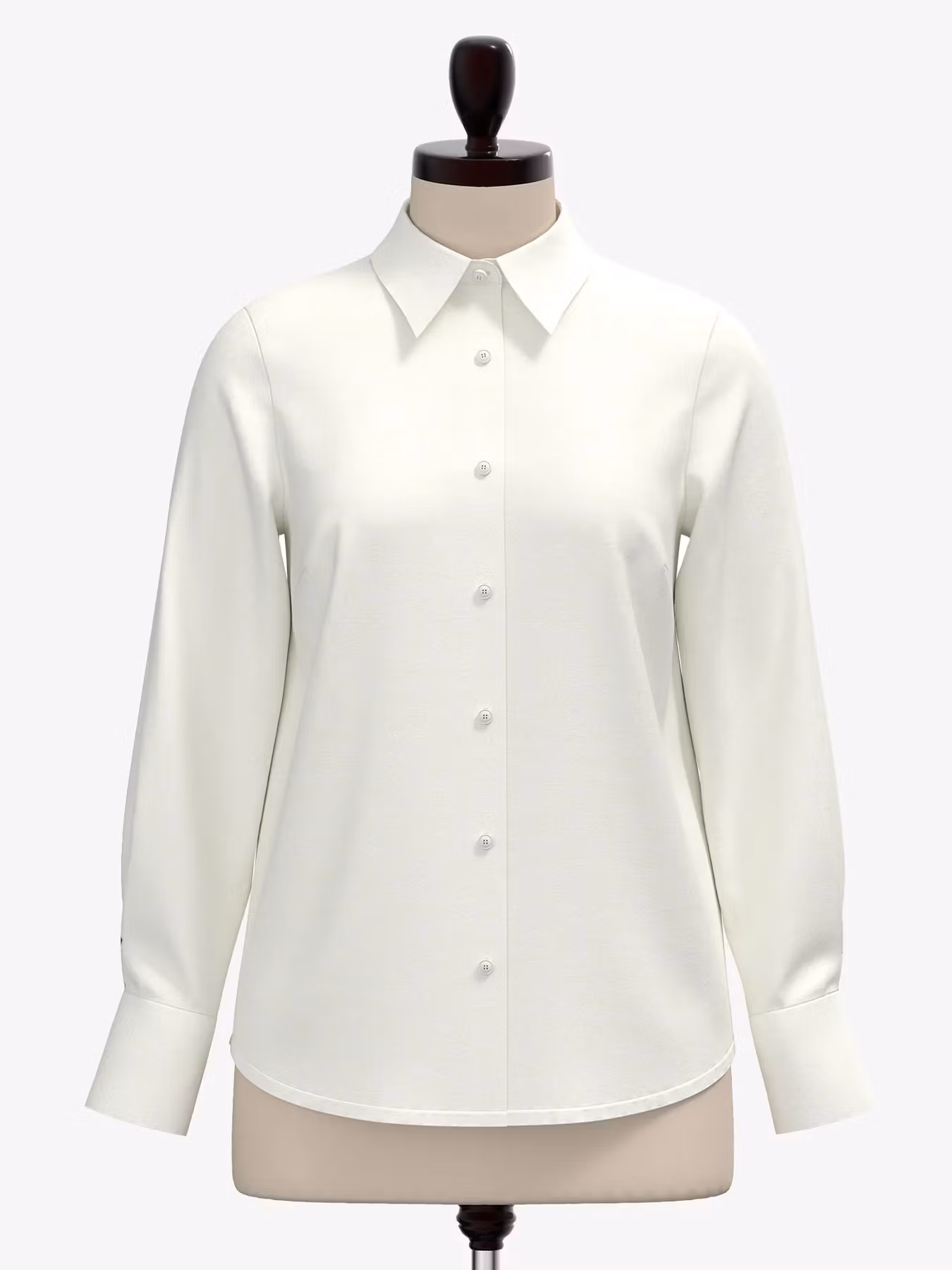 En elegant skjorta med normal passform, formsydda byst- och rygginsnitt som ger en vackert definierad silhuett, avslutad med en mjukt rundad fåll.