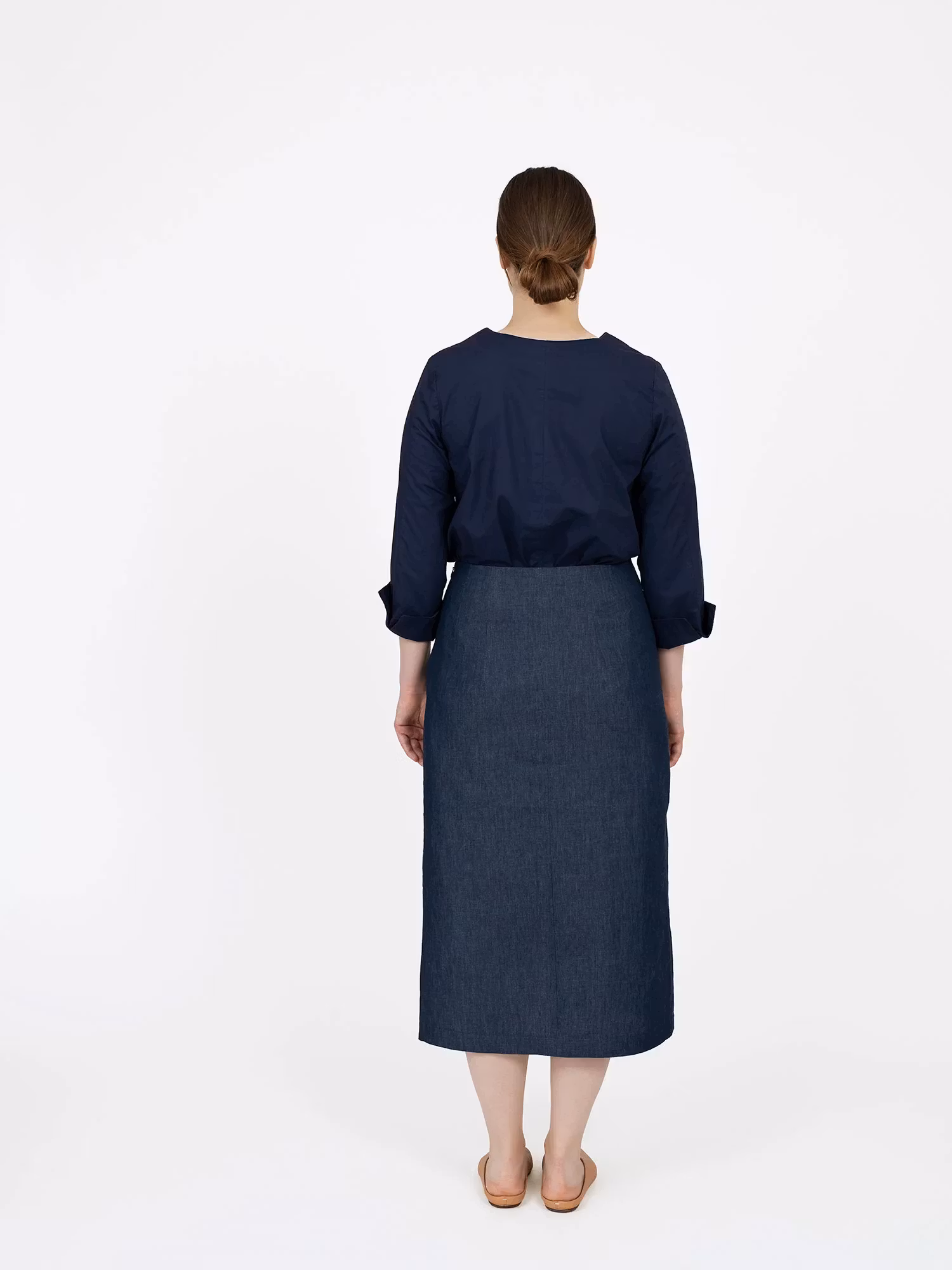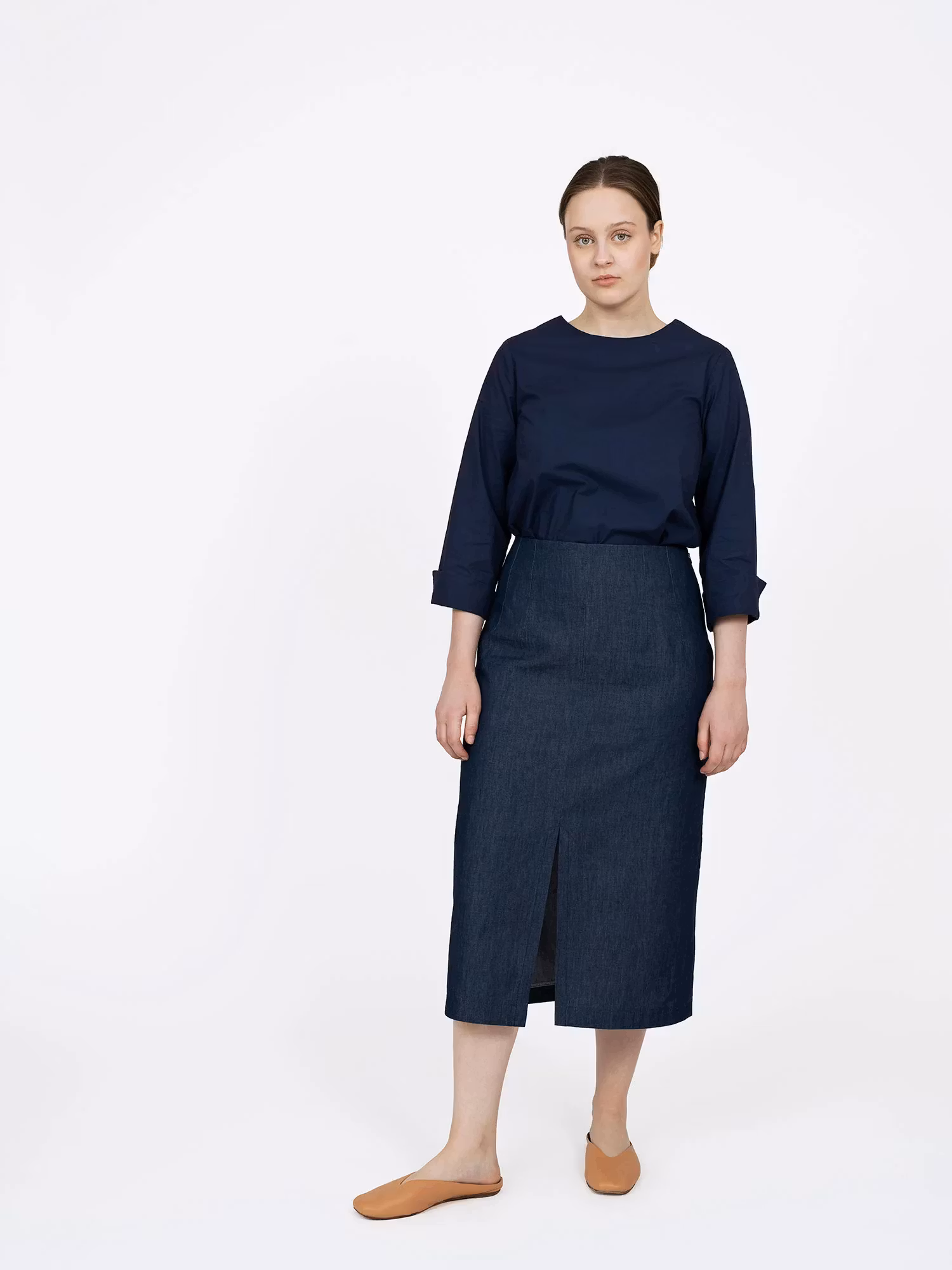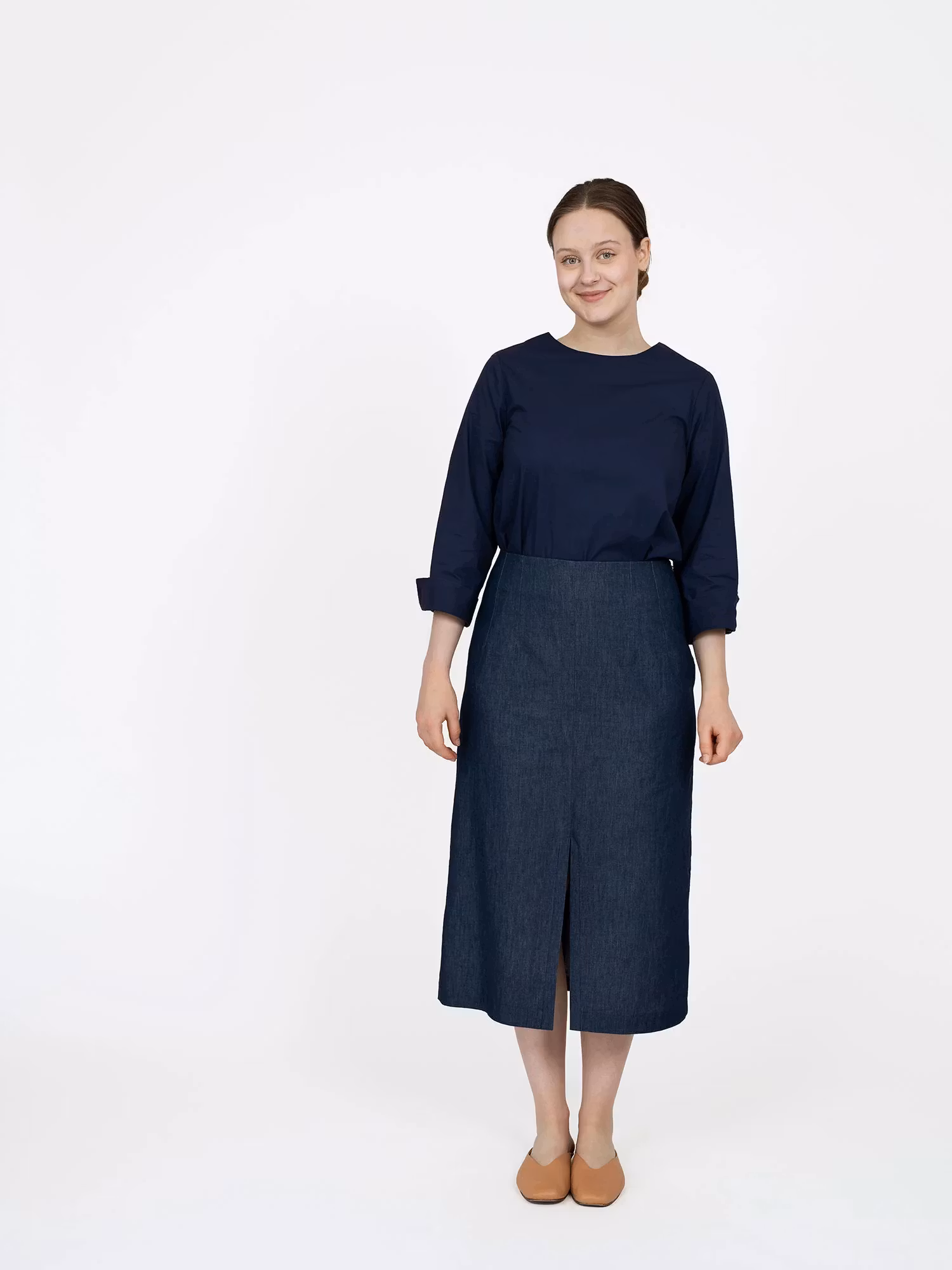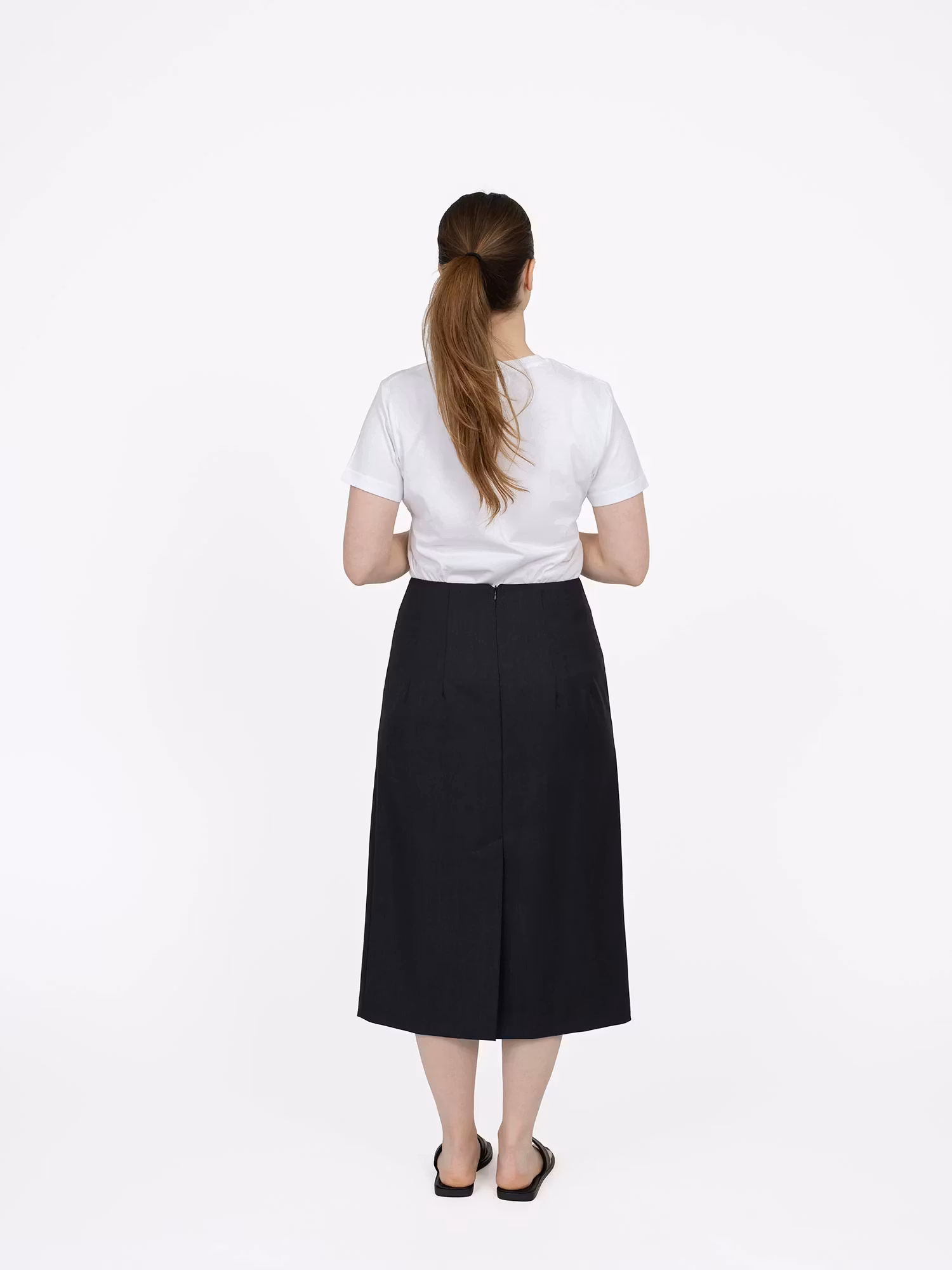 Pencil skirt is a timeless, fitted midi skirt. It features a back zip closure and comes without pockets. To ensure a flattering fit, the skirt includes four darts in the front and four in the back. While it has a regular waist, it can be customized with different add-ons for curvy or straight silhouettes. Also, you can choose to make the skirt with a front slit, back slit or back vent.