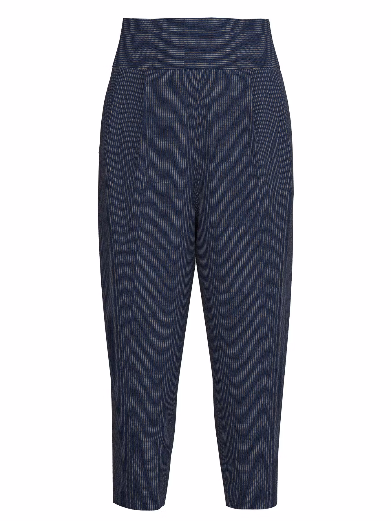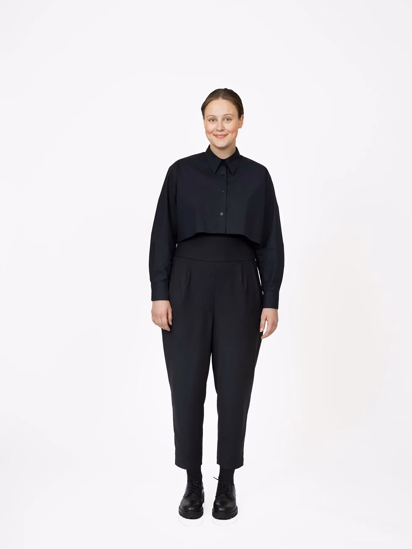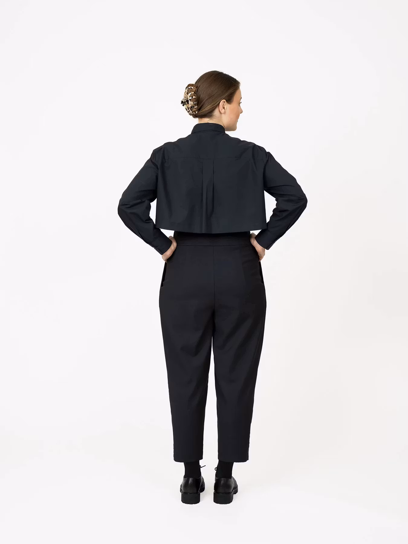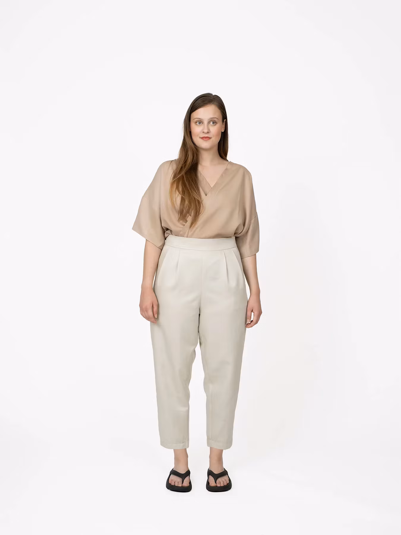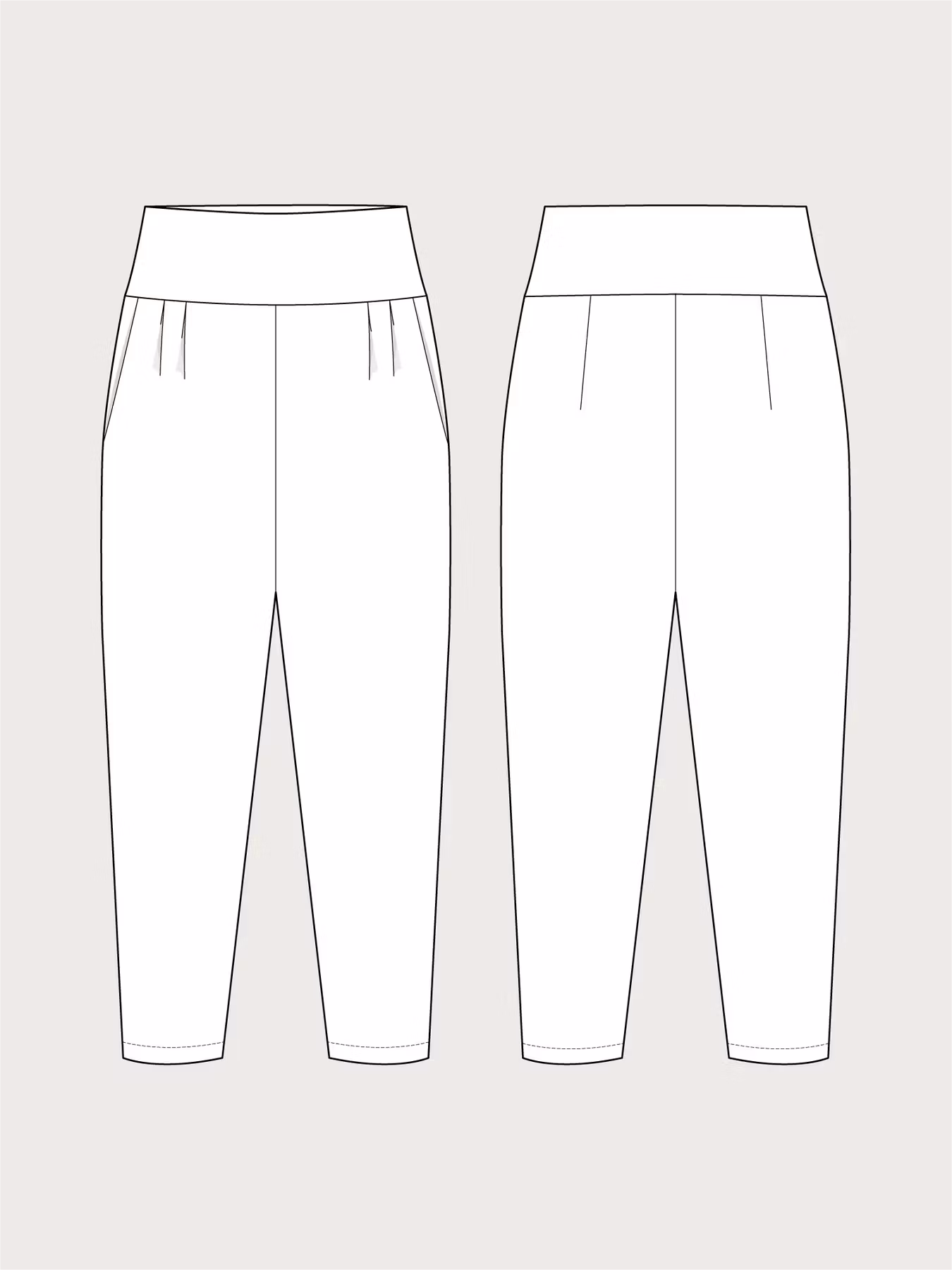 Plisserad, lite kortare byxa, med låg gren. Du kan göra den med antingen högt eller lågt midjeband, samt en normal eller rak midja. Snedställda framfickor och en dragkedja på vänster sida.
