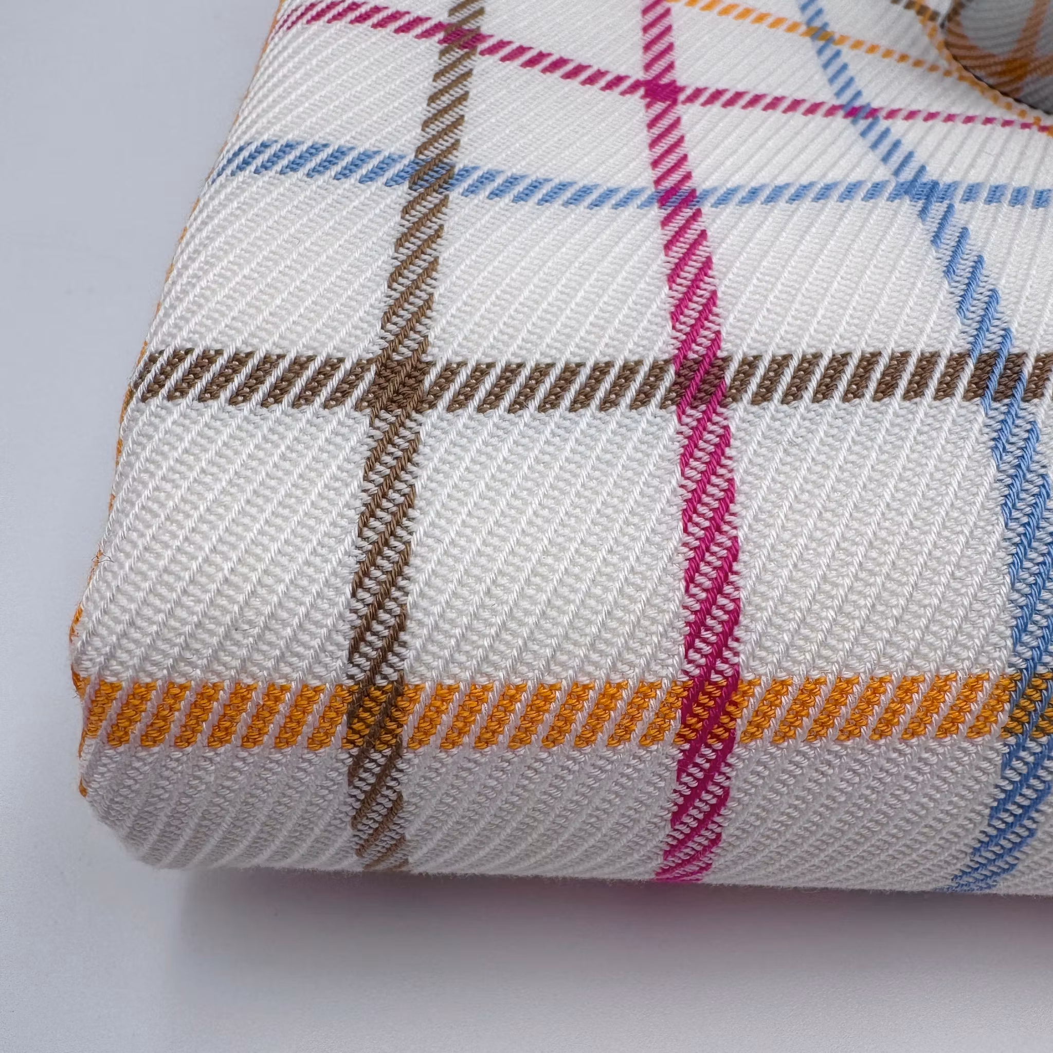 Färg: gräddvit botten, rutor i gult, cerise, ljusblått och beige.