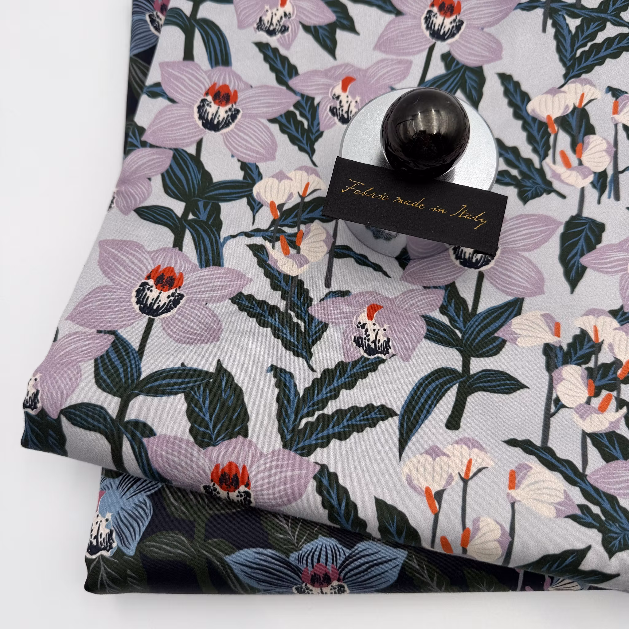 Färg: ljus gråblå botten, blommor i ljuslila och buteljgröna blad.