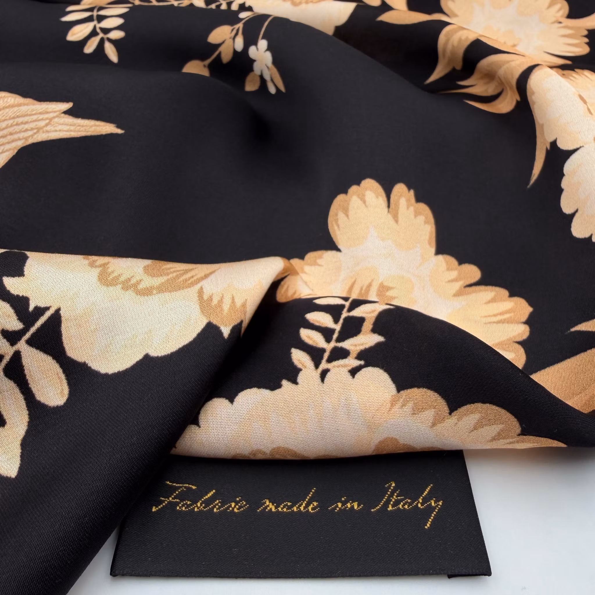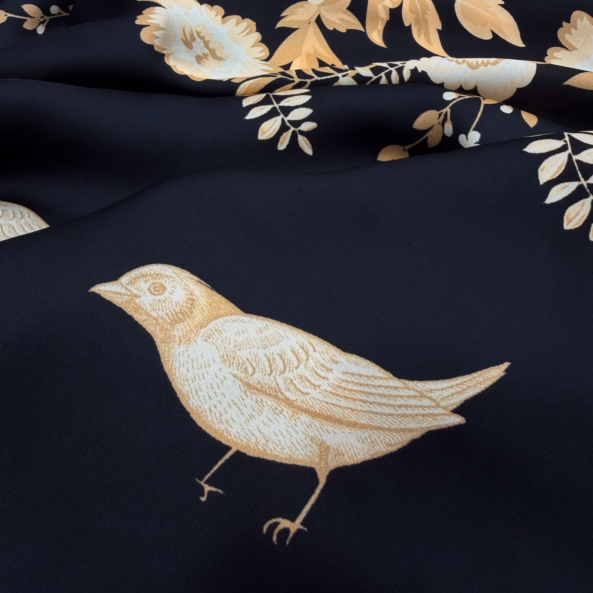 Färg: svart botten, blombårder längs båda sidorna, fåglar i mitten. Mönster i guldbeige.