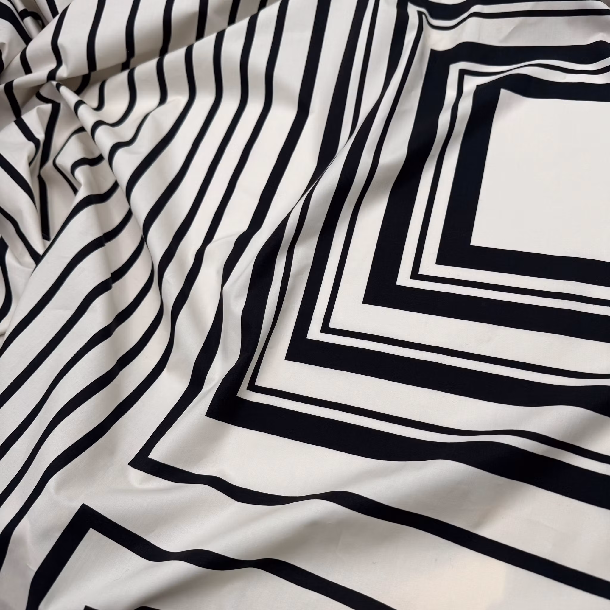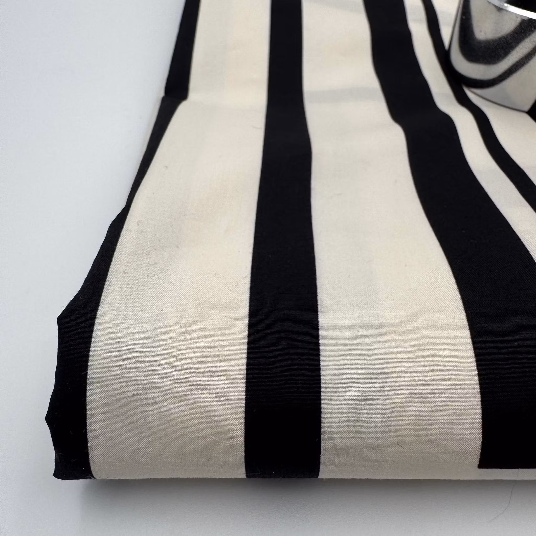 Färg: Gräddvit botten och svart mönster, ränder i mitten och kvadrater längs sidorna.
