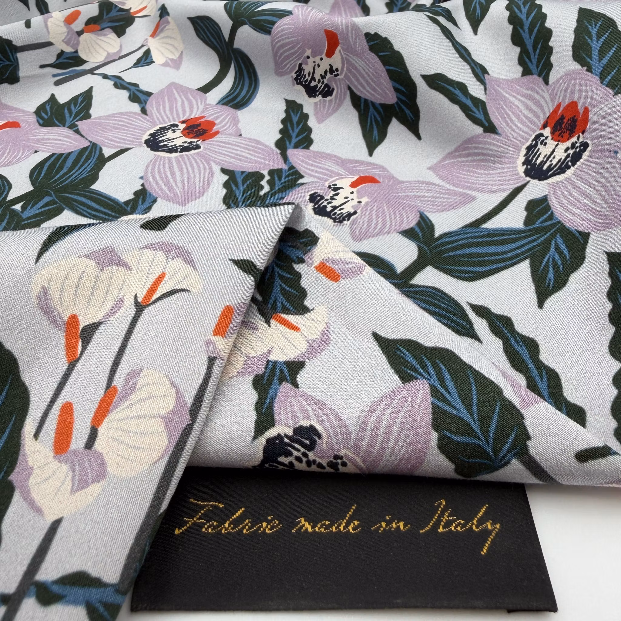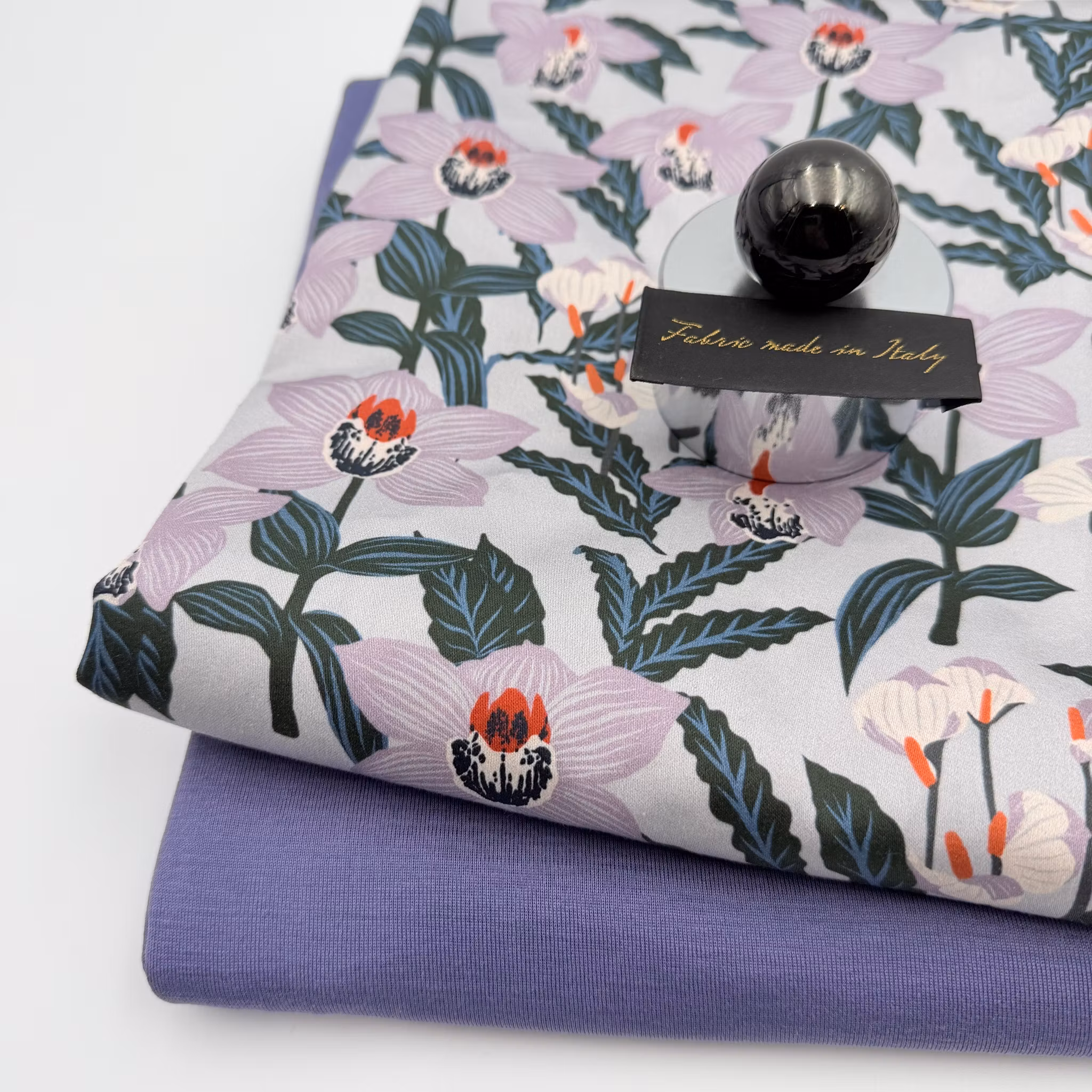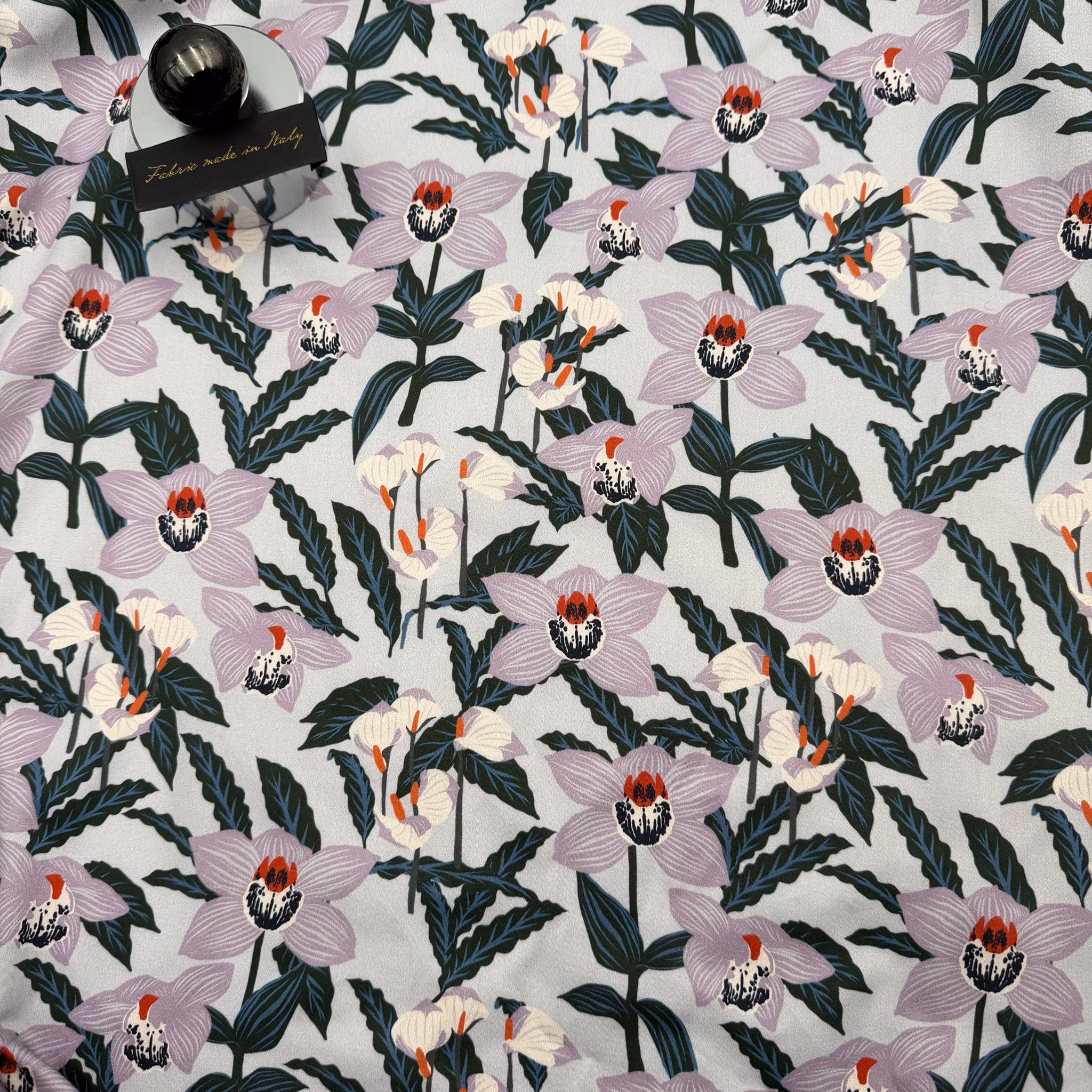 Färg: ljus gråblå botten, blommor i ljuslila och buteljgröna blad.