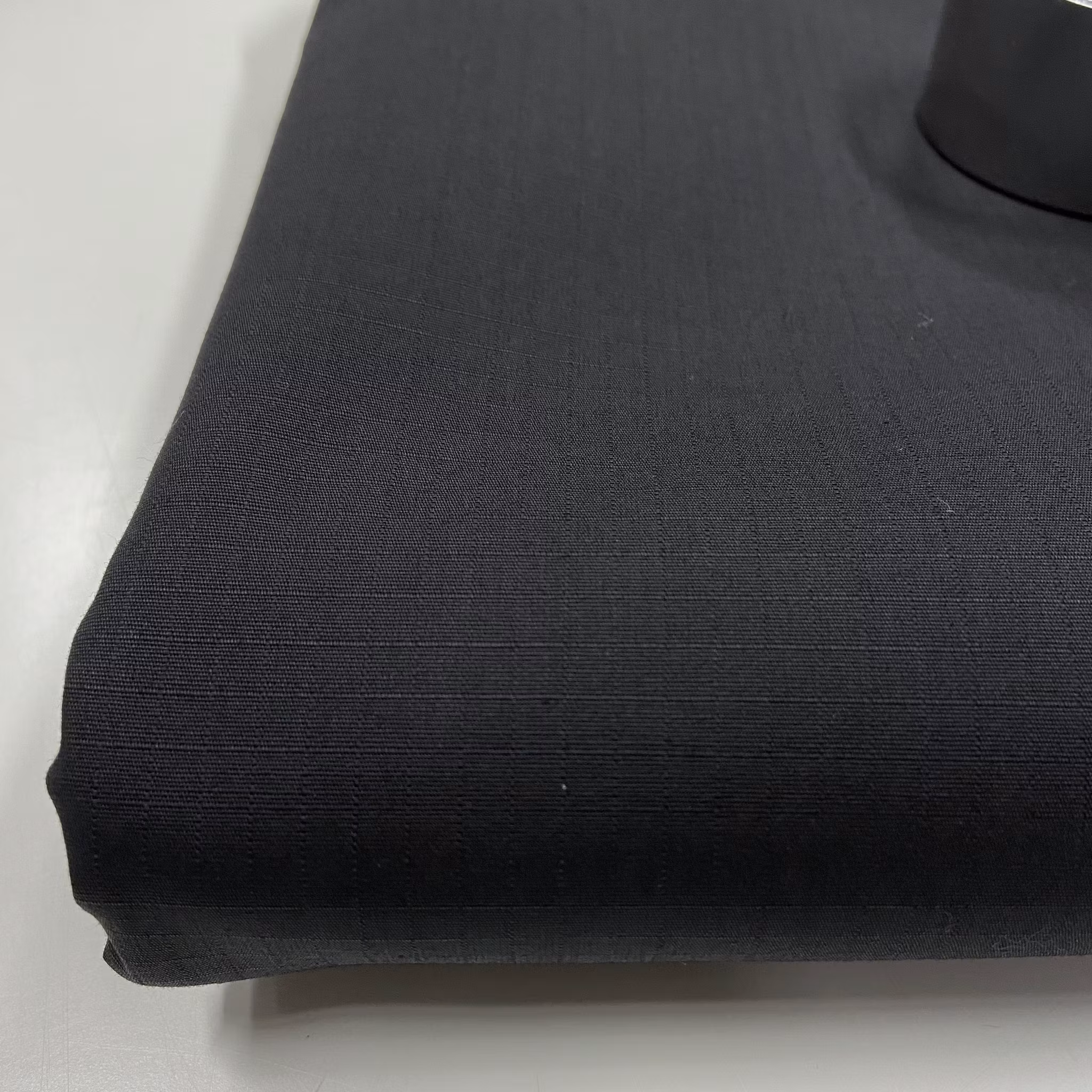 Material: 100% bomull, kraftig och tät men verkar fullt hanterbart att sy detaljer av. Diskret vävt rutmönster. Belagd baksida så sannolikt vindtätt.