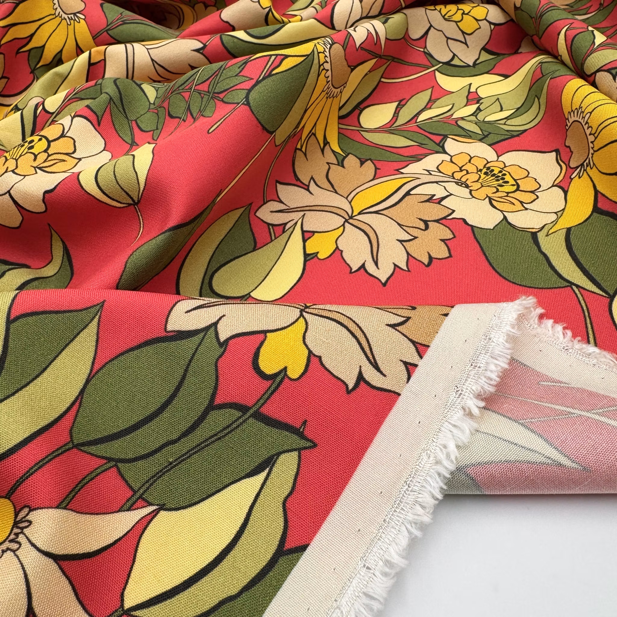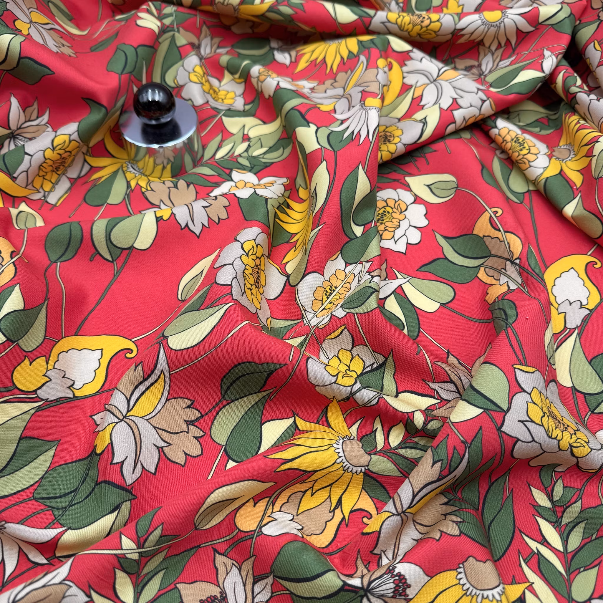 Färg: Röd botten, blommor i lila, gult och beige och gröna blad.