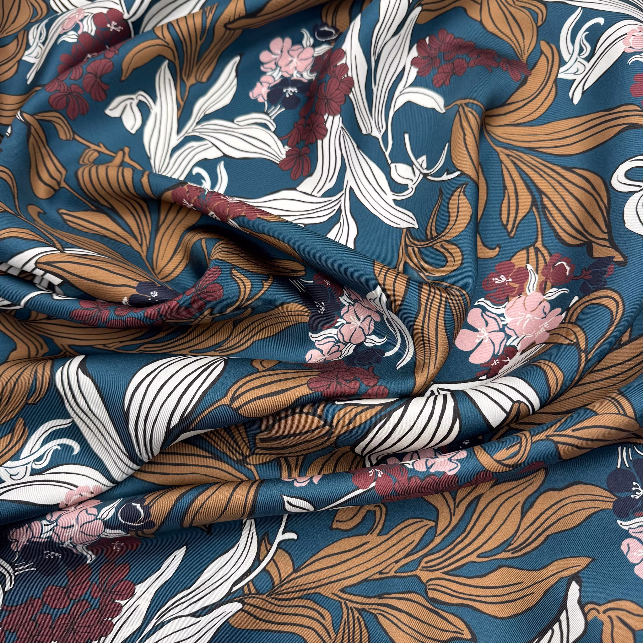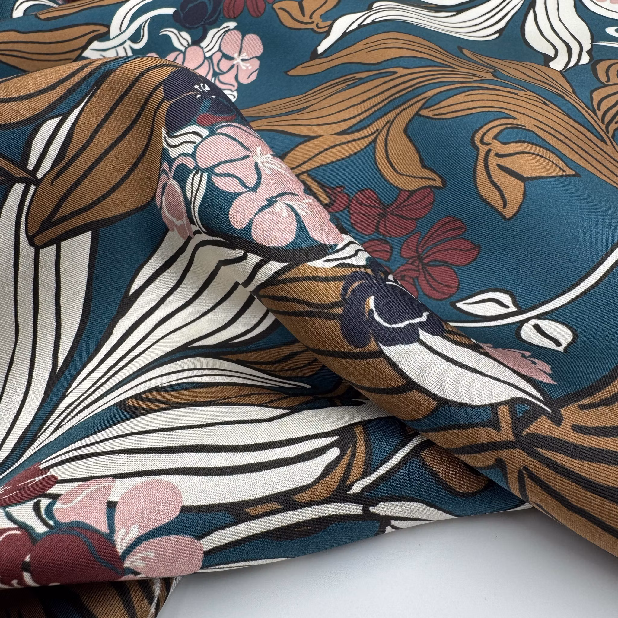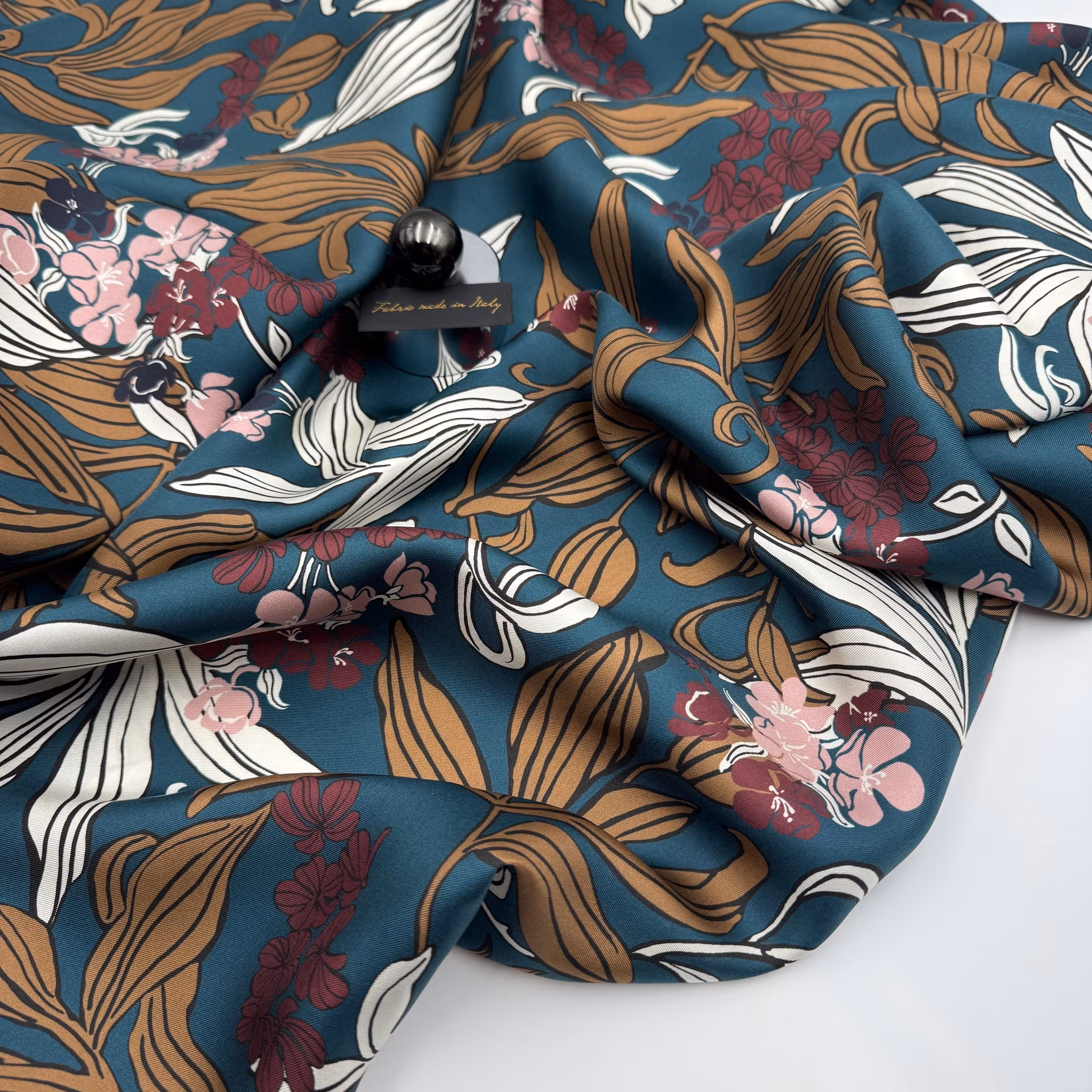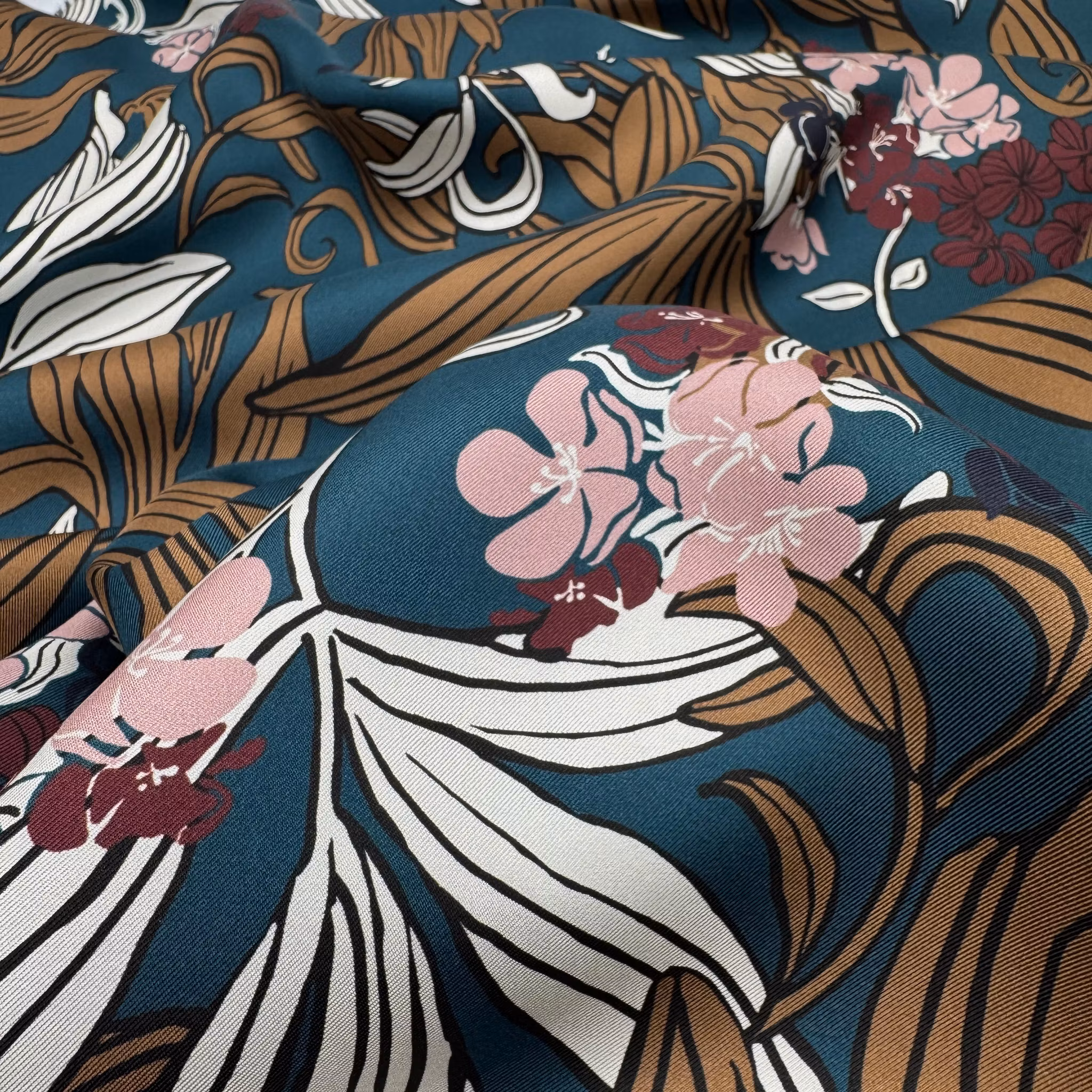 Färg: Petrol botten, blommor och blad i nötbrunt, vitt, rosa, vinrött och marin.