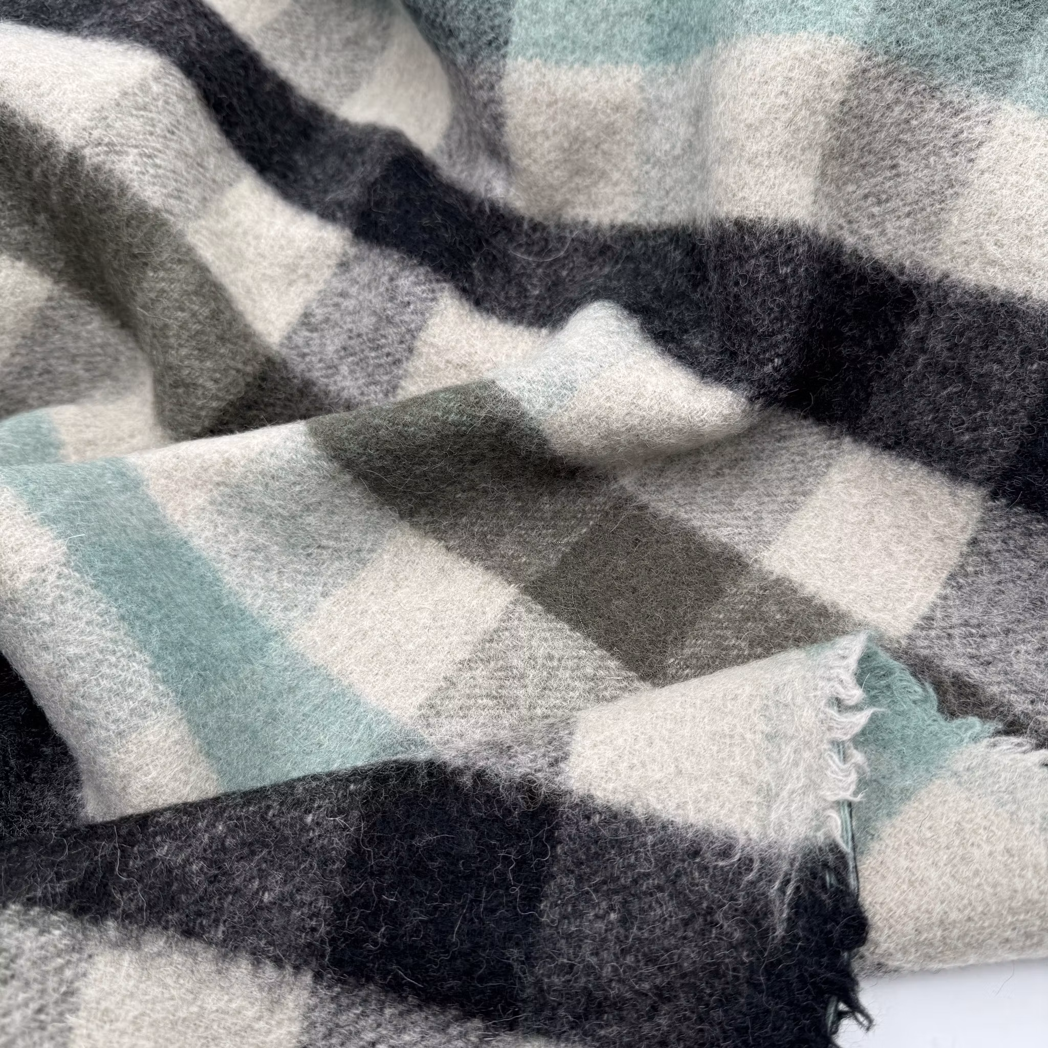 Material: 100% Ull, mjuk och fluffig, lätt men varm och gosig. Rutorna är ca 5 cm.