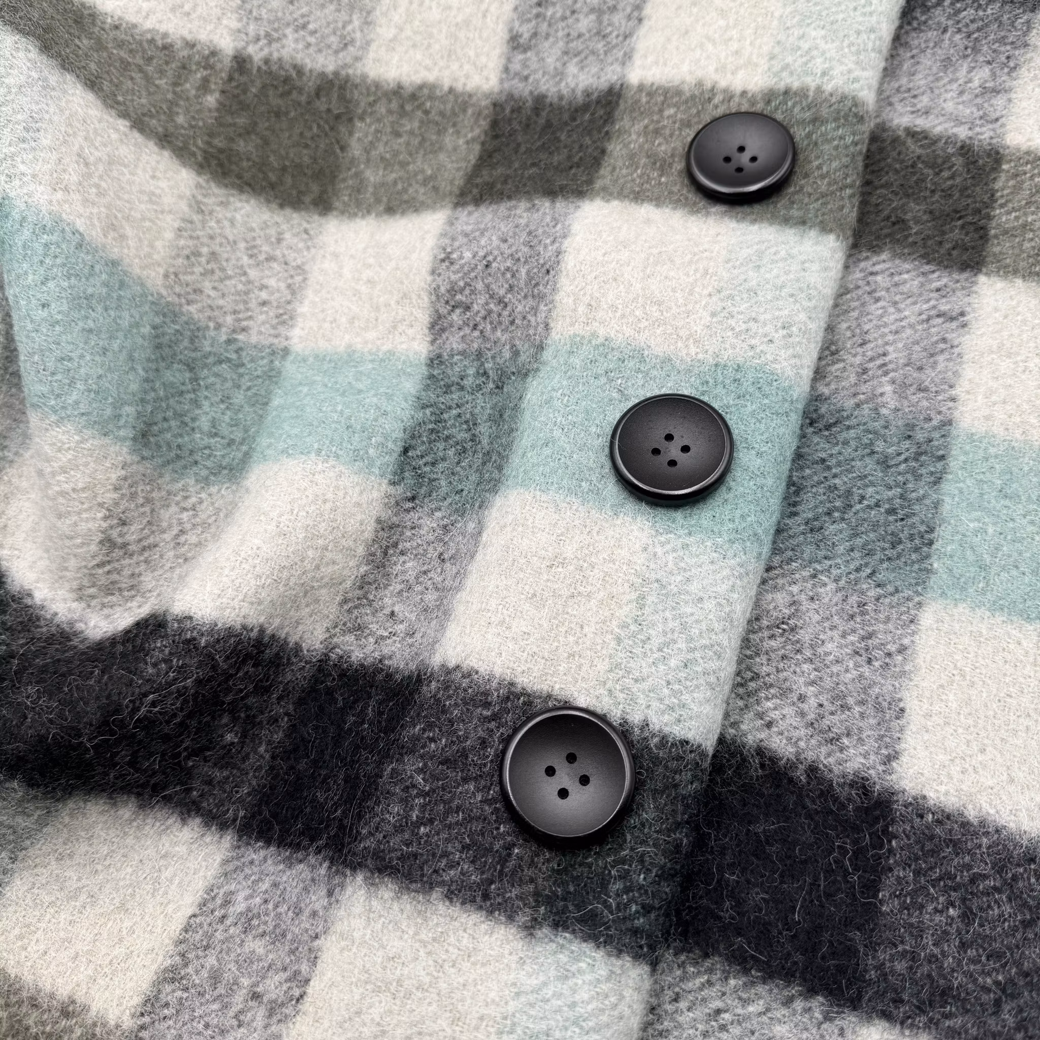 Färg: Ljus gråbeige botten, rutor i svart, militärgrön och ljusturkos.