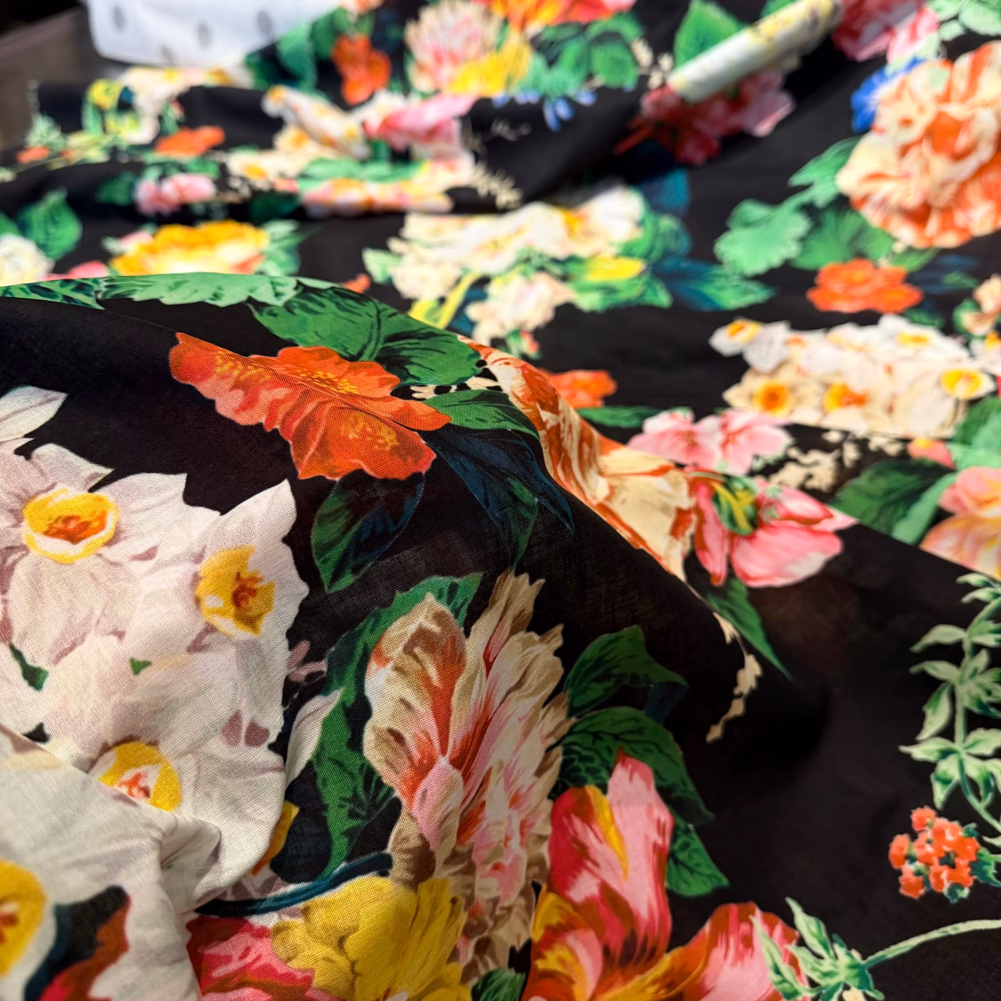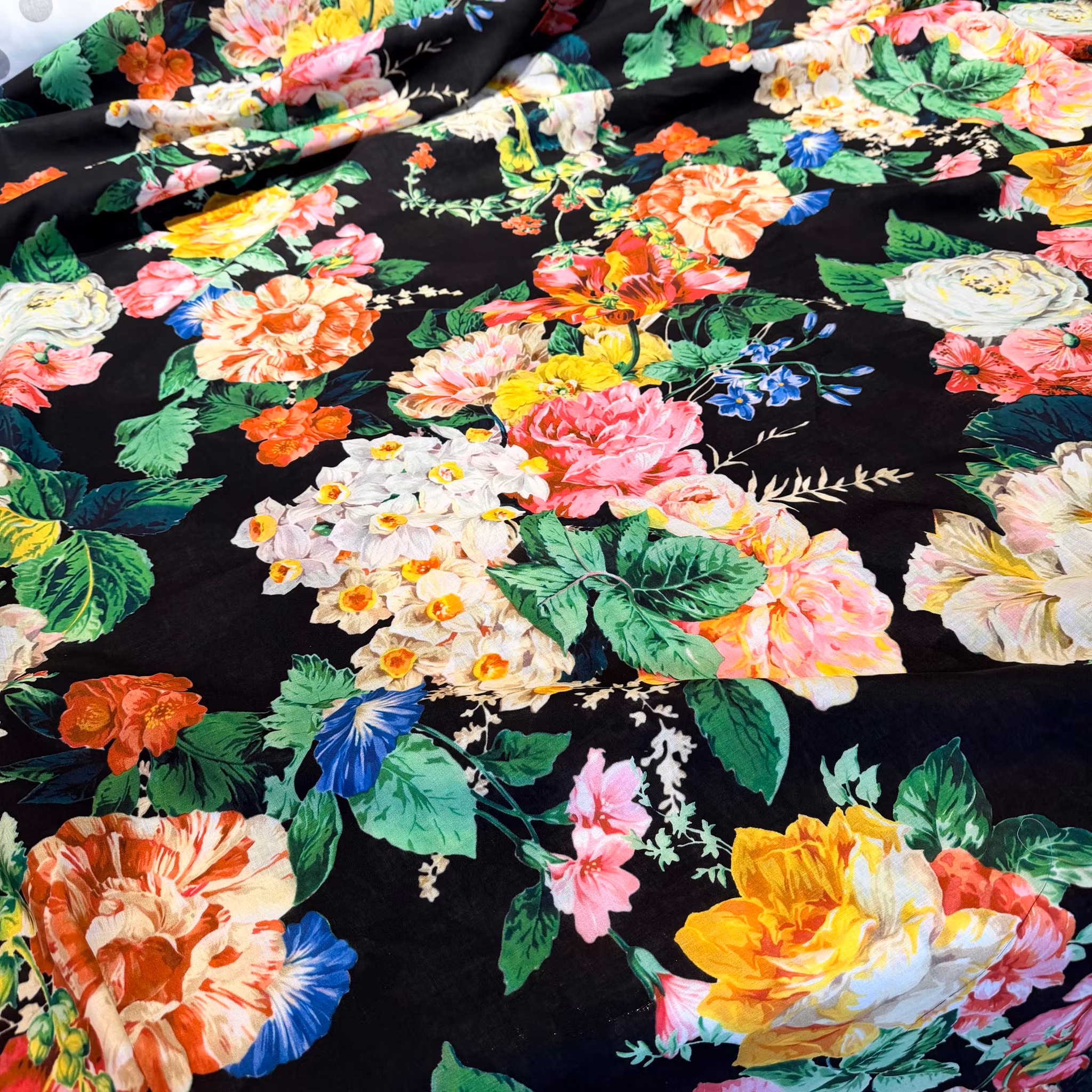 Färg: Svart botten, stora blommor i klara färger.