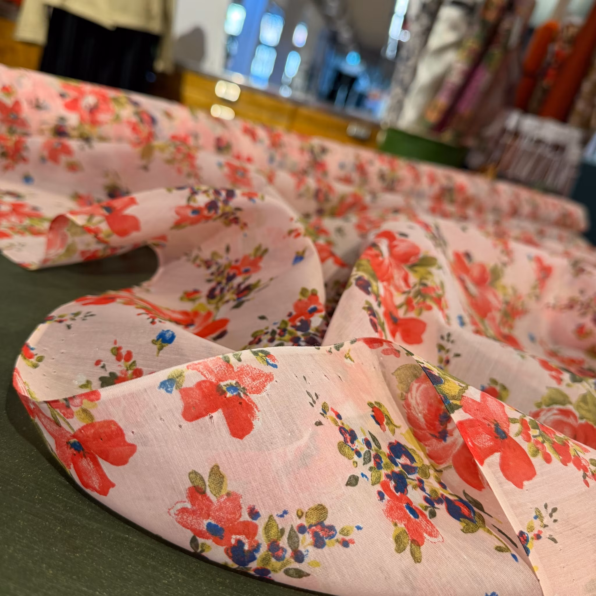 Färg: rosa botten med tryckta blommor i rött, blått och grönt.