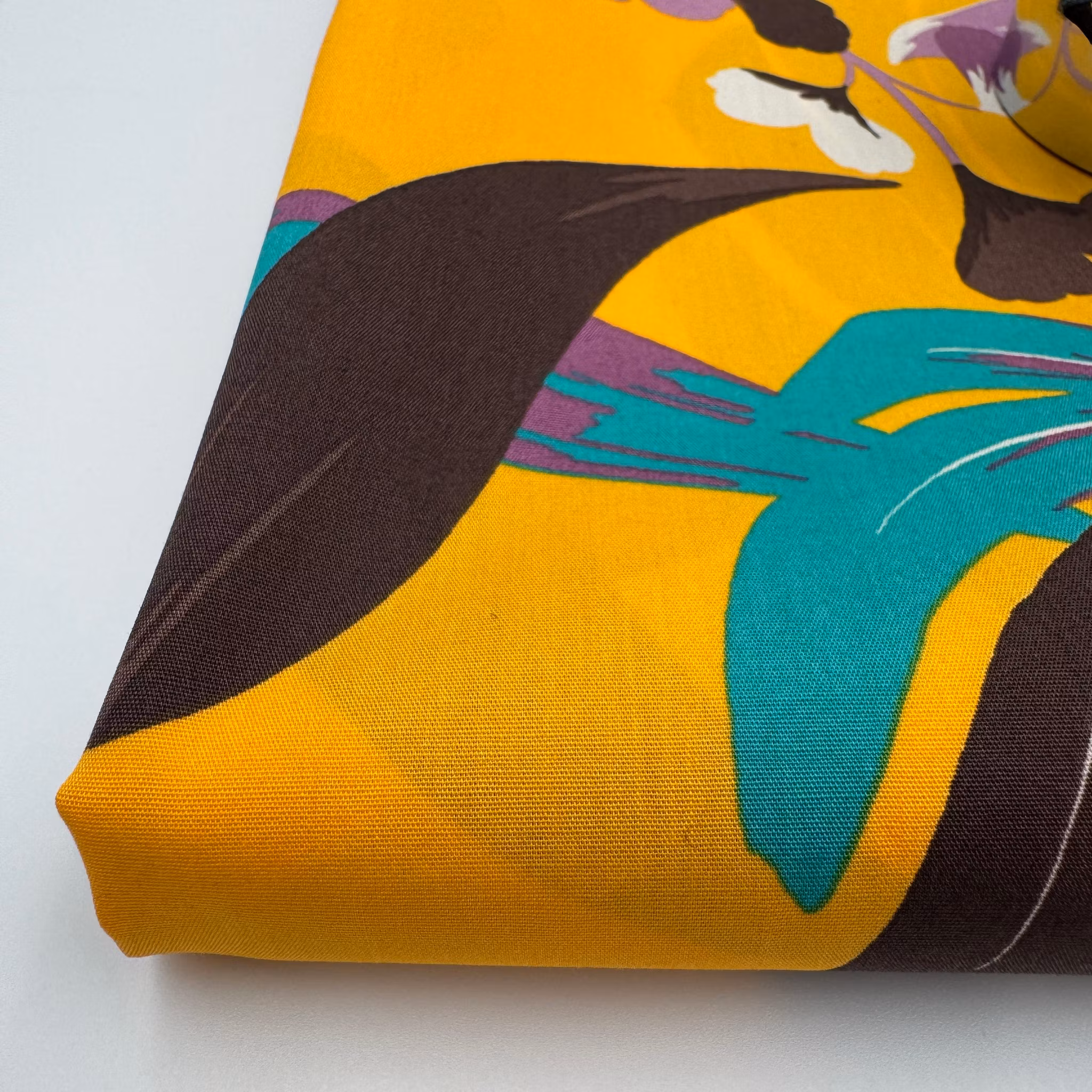 Färg: gul botten, mönster i brunt, turkos och lila.