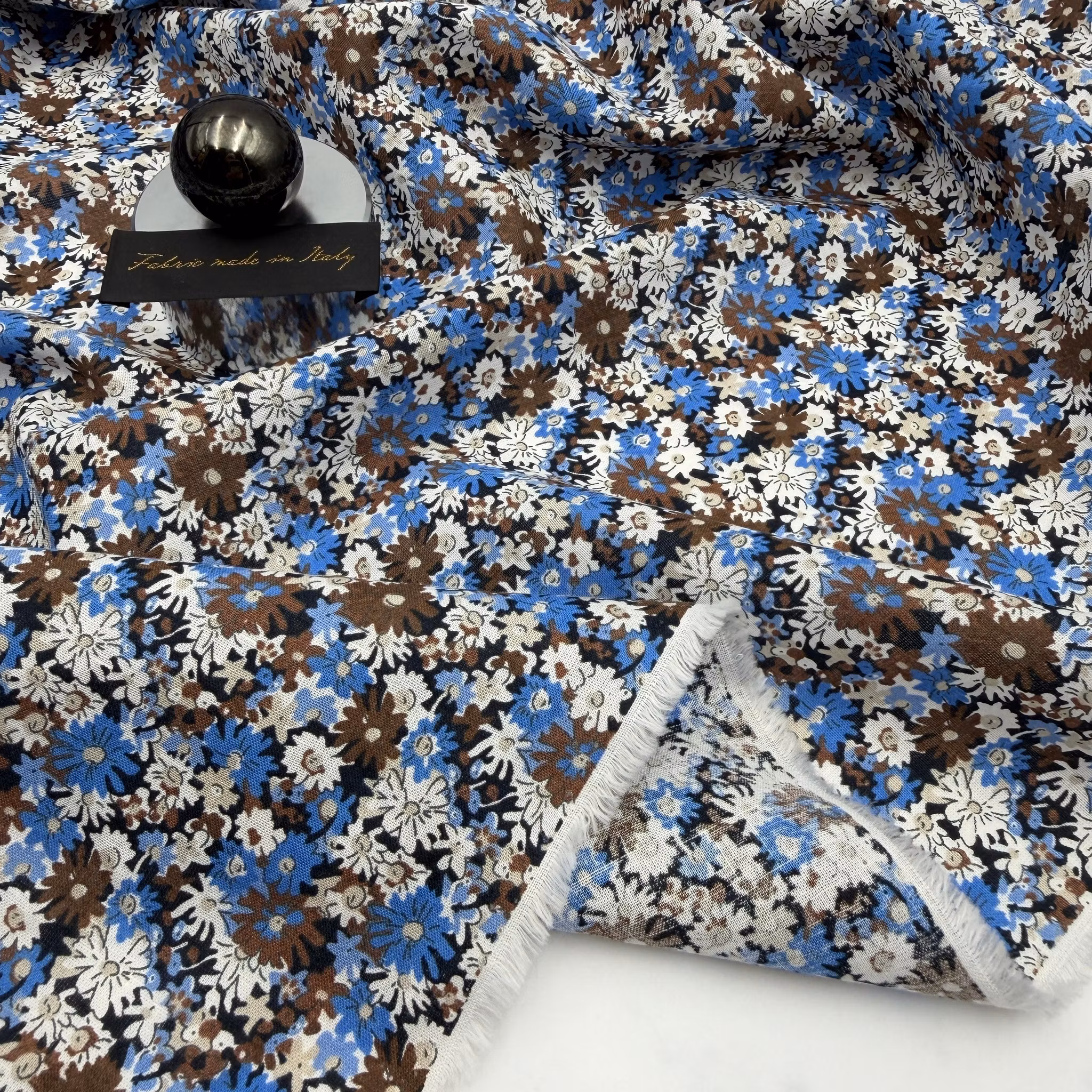 Färg: svart botten, blommor i vitt, blått och brunt.