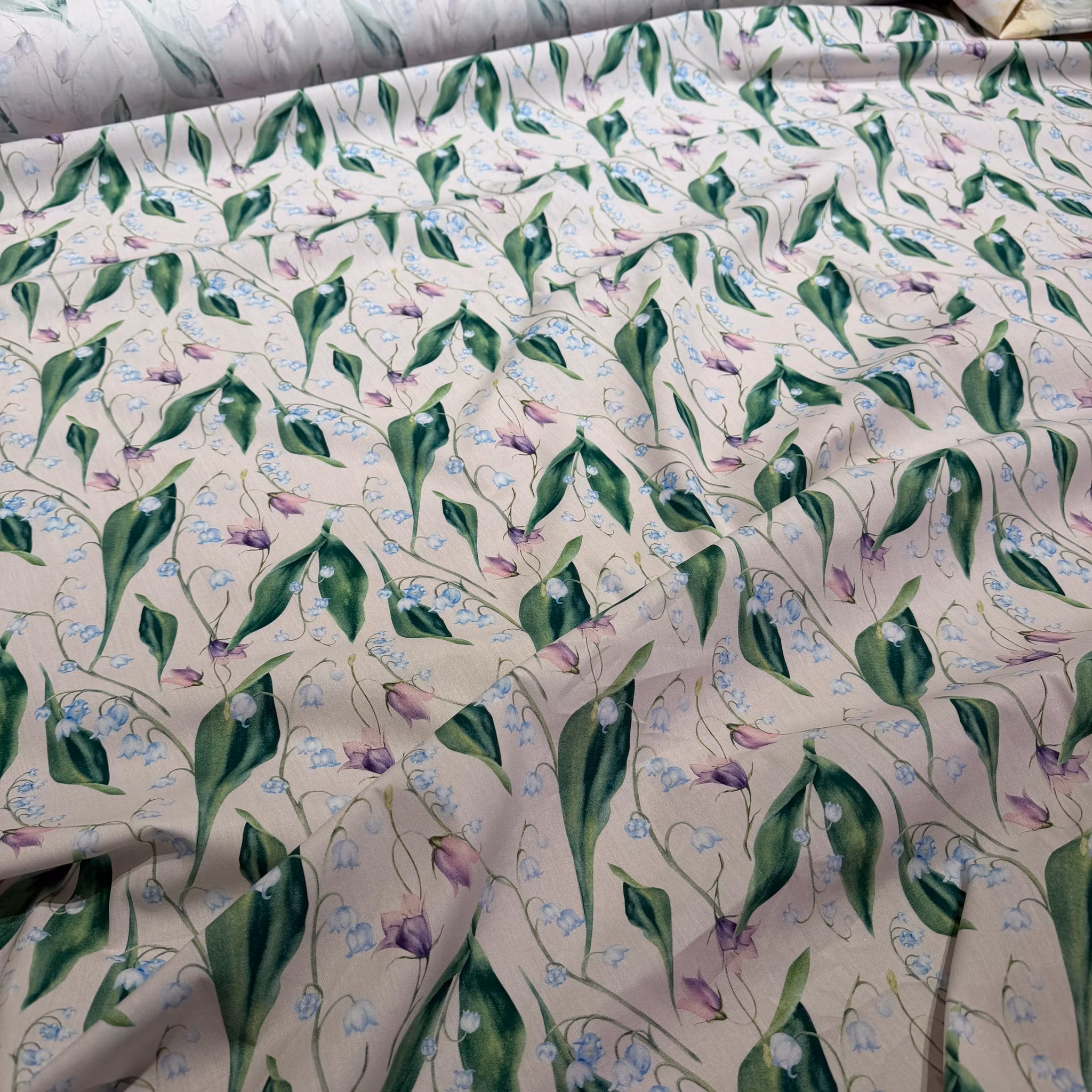 Färg: ljusrosa botten, blommönster i ljusblått och lila, gröna blad