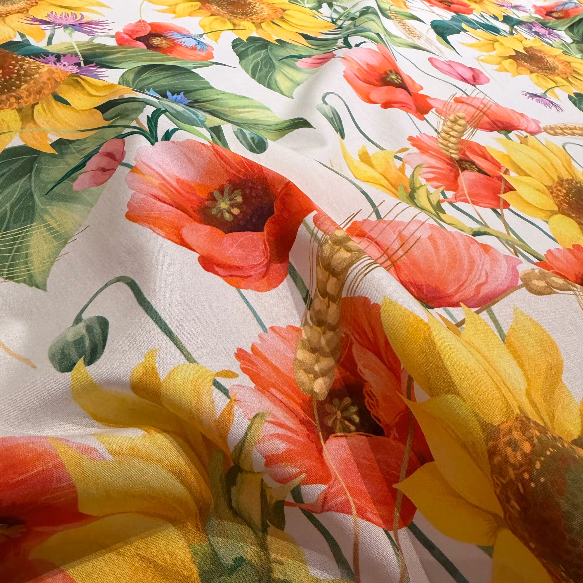 Färg: vit botten, mönster i rött och gult, grönt och blått.