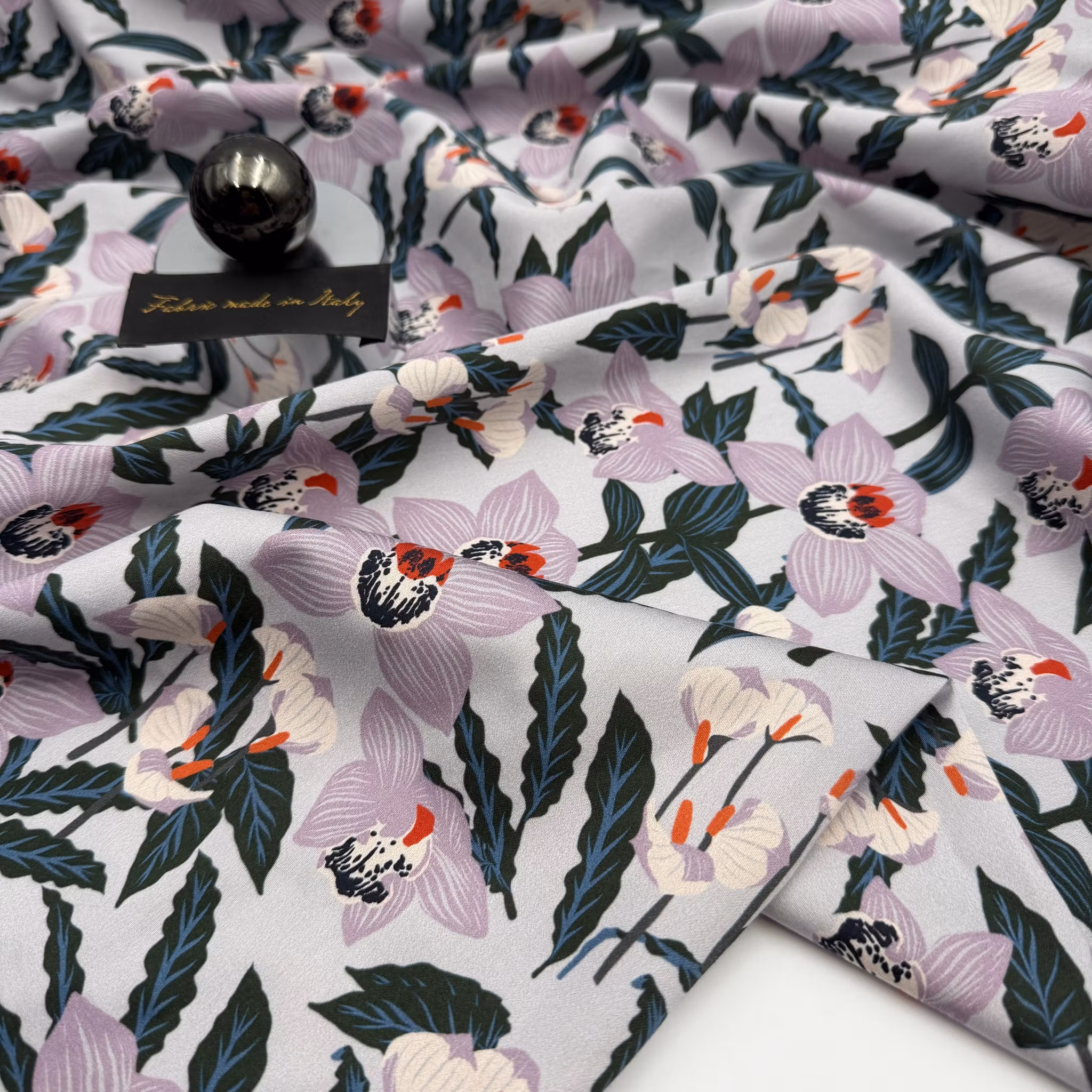 Färg: ljus gråblå botten, blommor i ljuslila och buteljgröna blad.