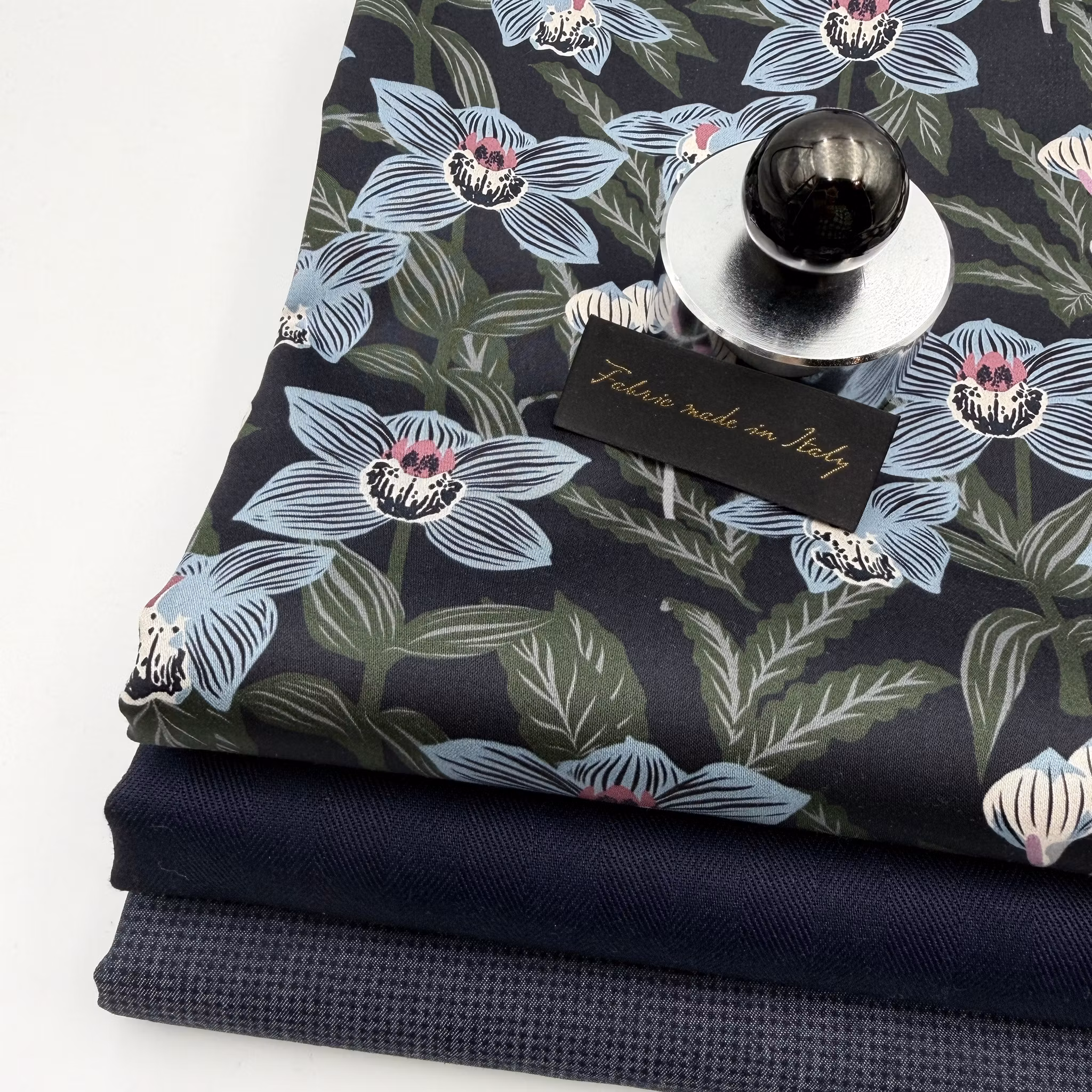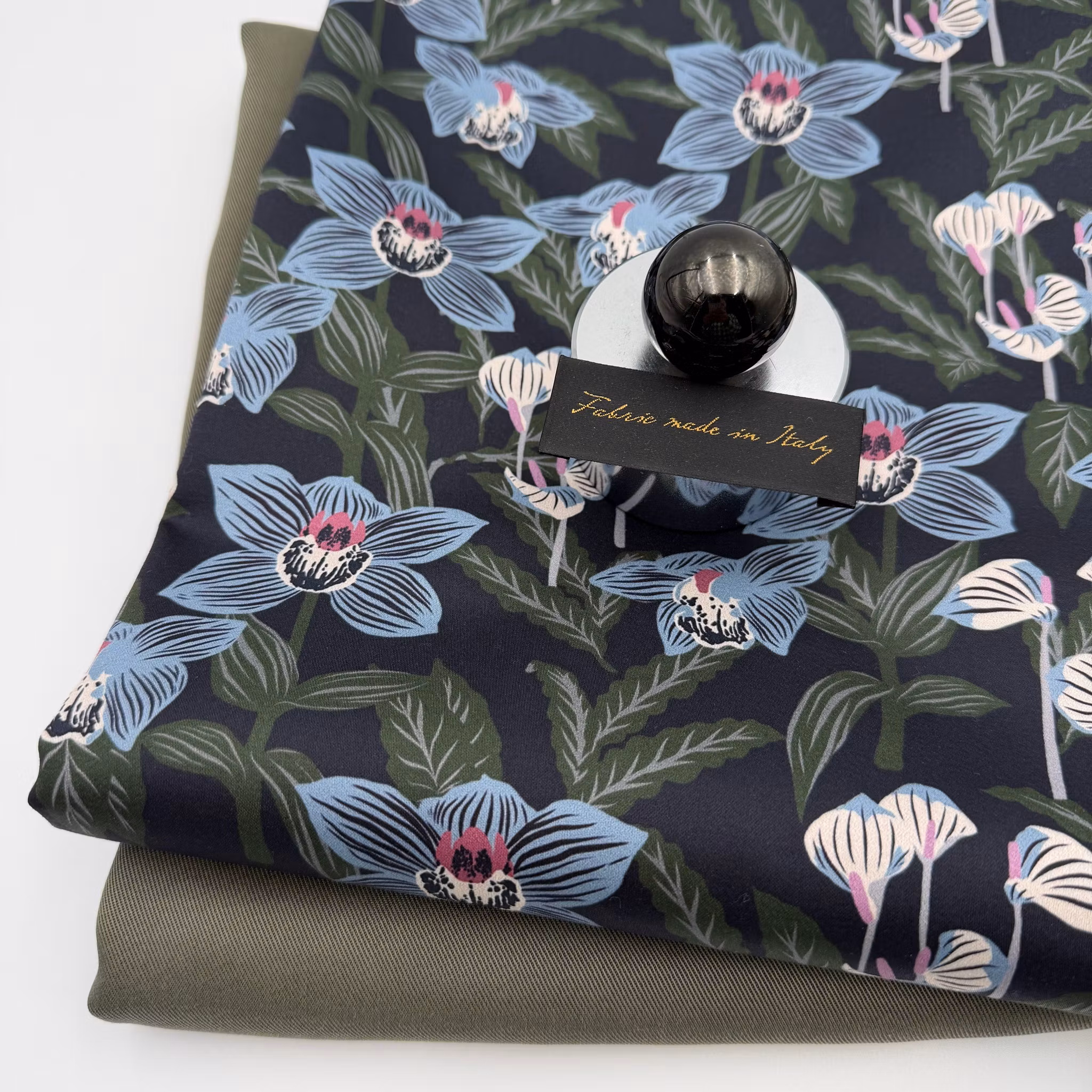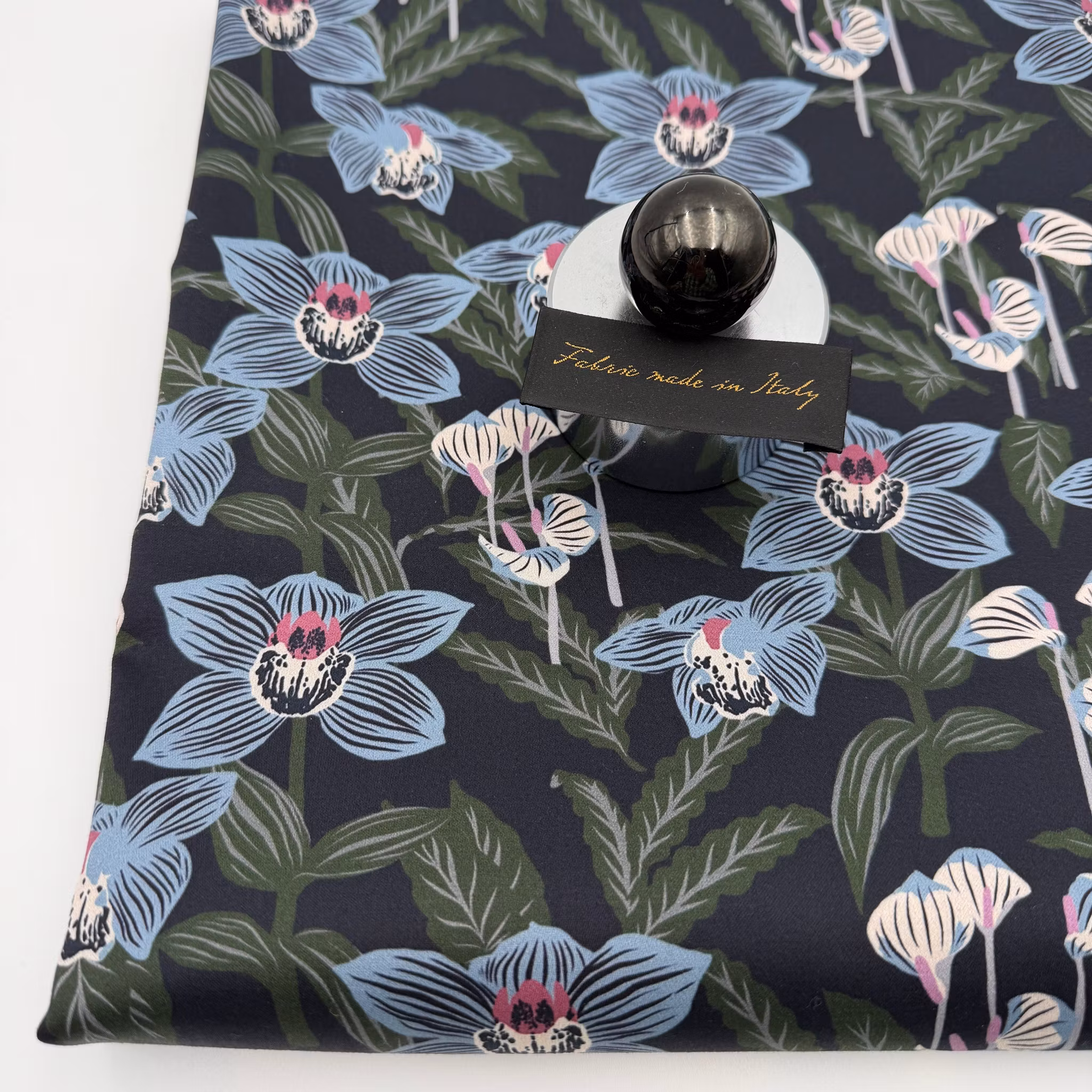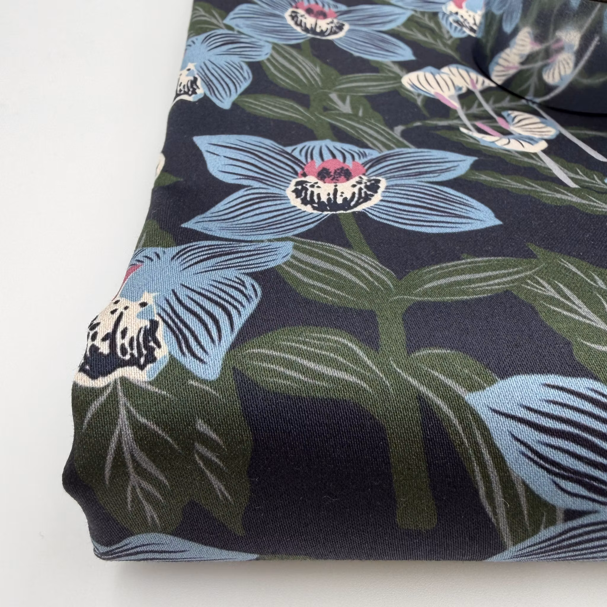 Färg: mörk marin botten, blommor i ljusblått och gröna blad.